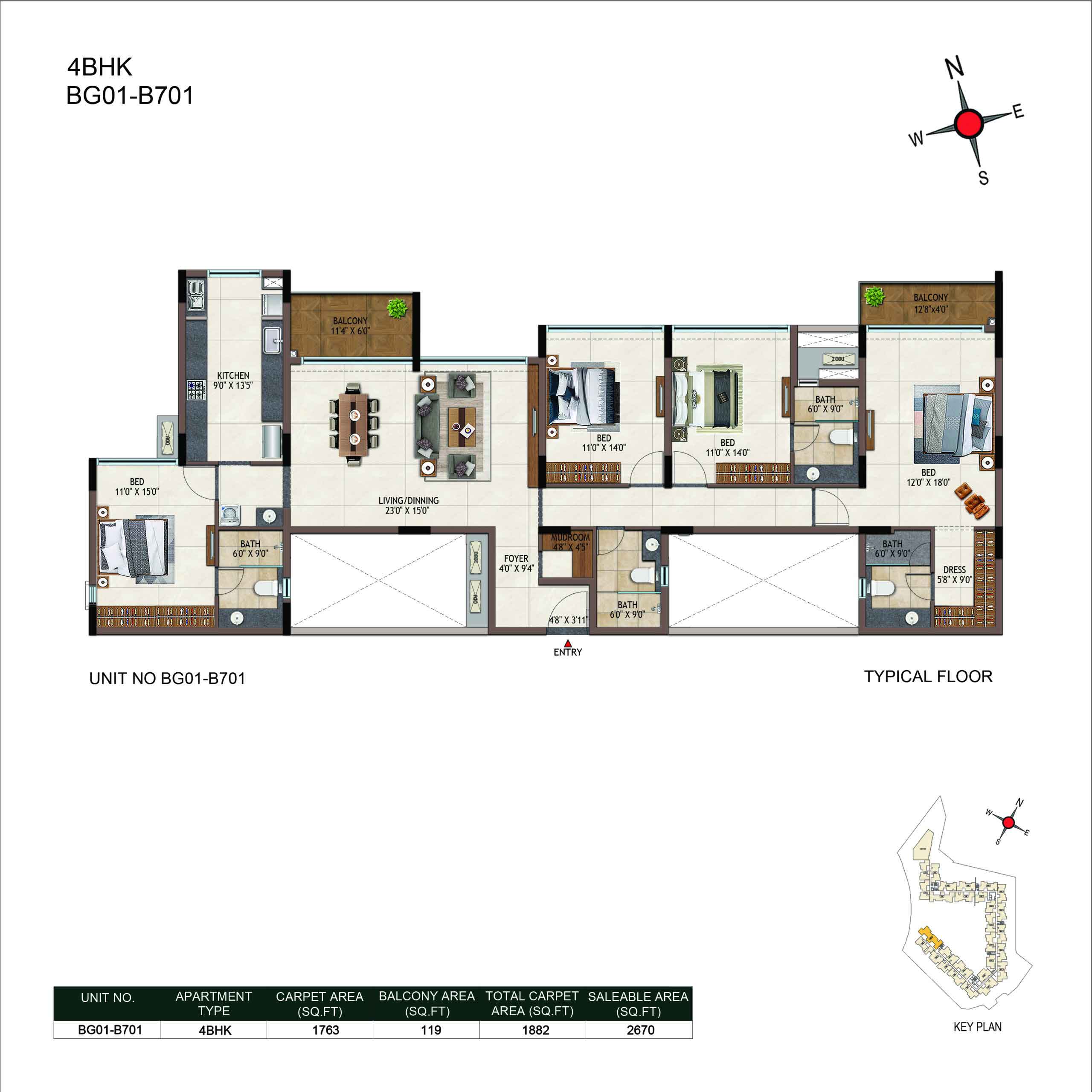 | 4 BHK | Elite | 2609 Sqft - 2670 Sqft | Rs 7649 / Sqft | Rs 2.07 Cr to 2.11Cr |