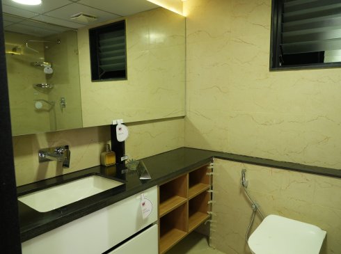 One of the bathrooms : Anti-skid ceramic tiles of size 600x600mm with granite in shower area