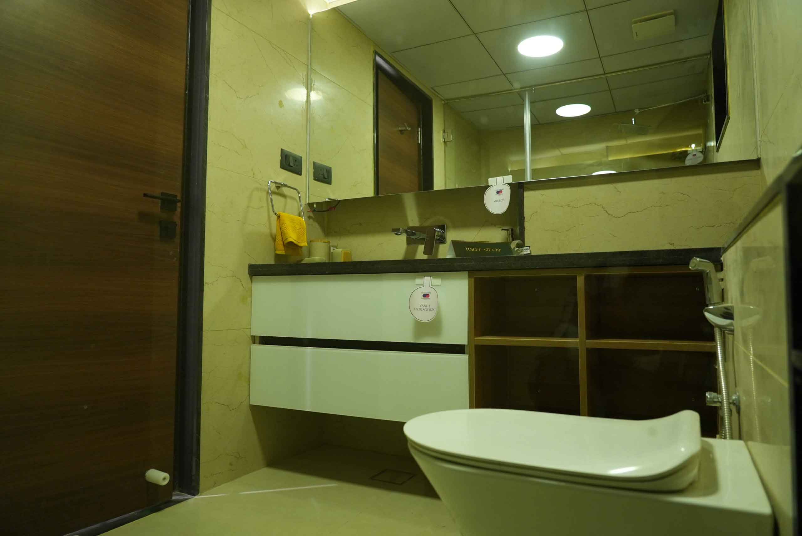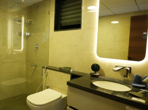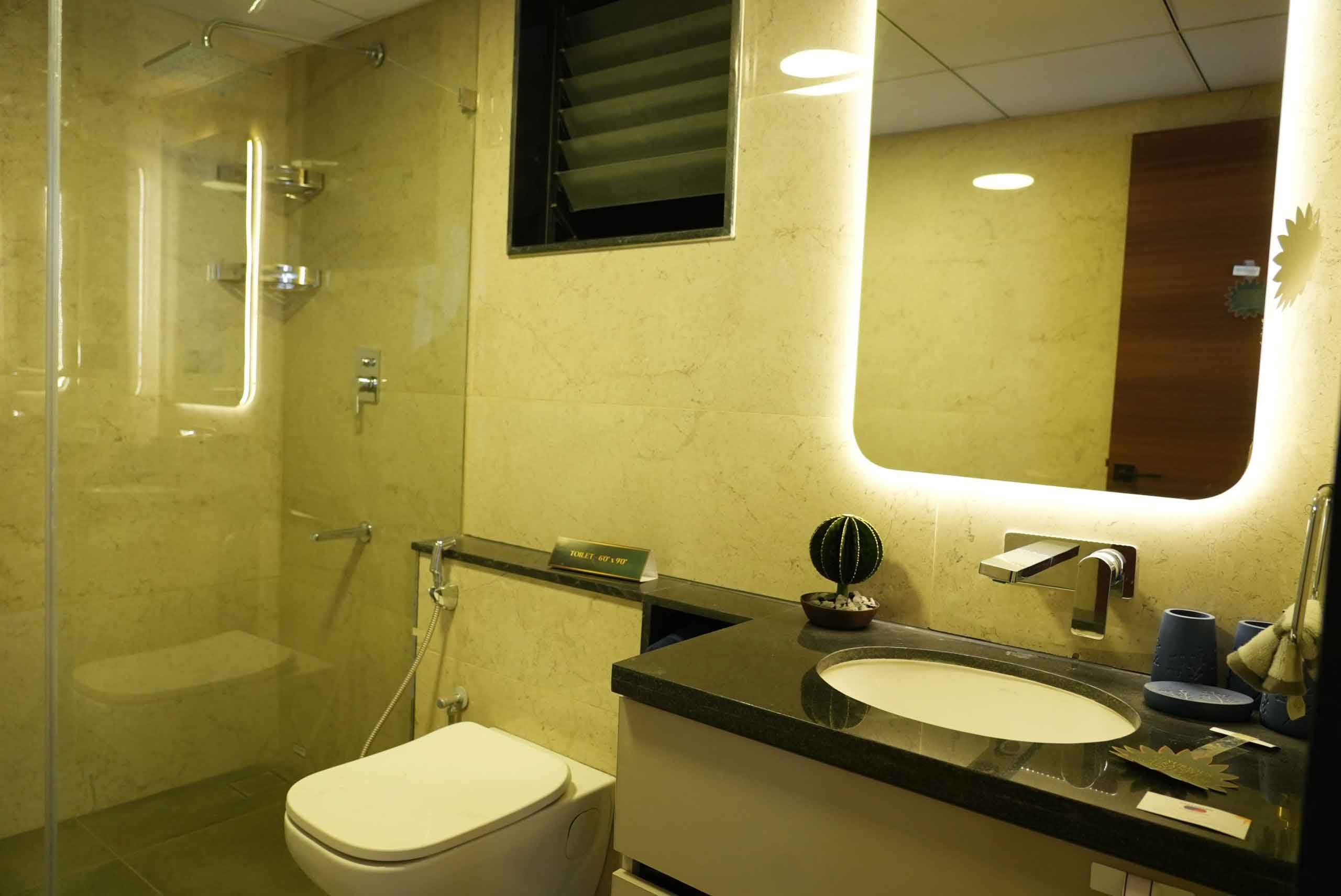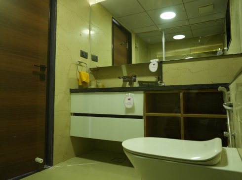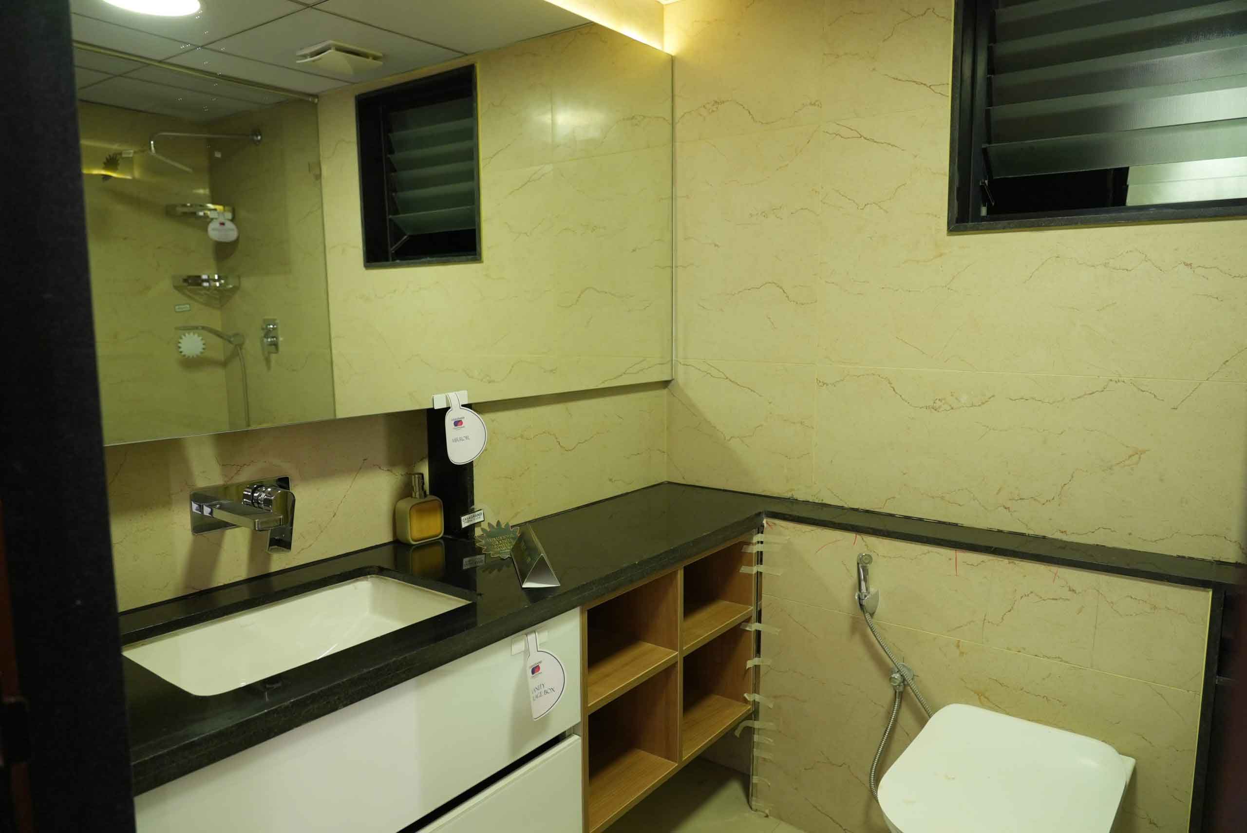 Bathroom : Ceramic tile of size 600x1200mm till false ceiling height & above will be finished with a coat of primer