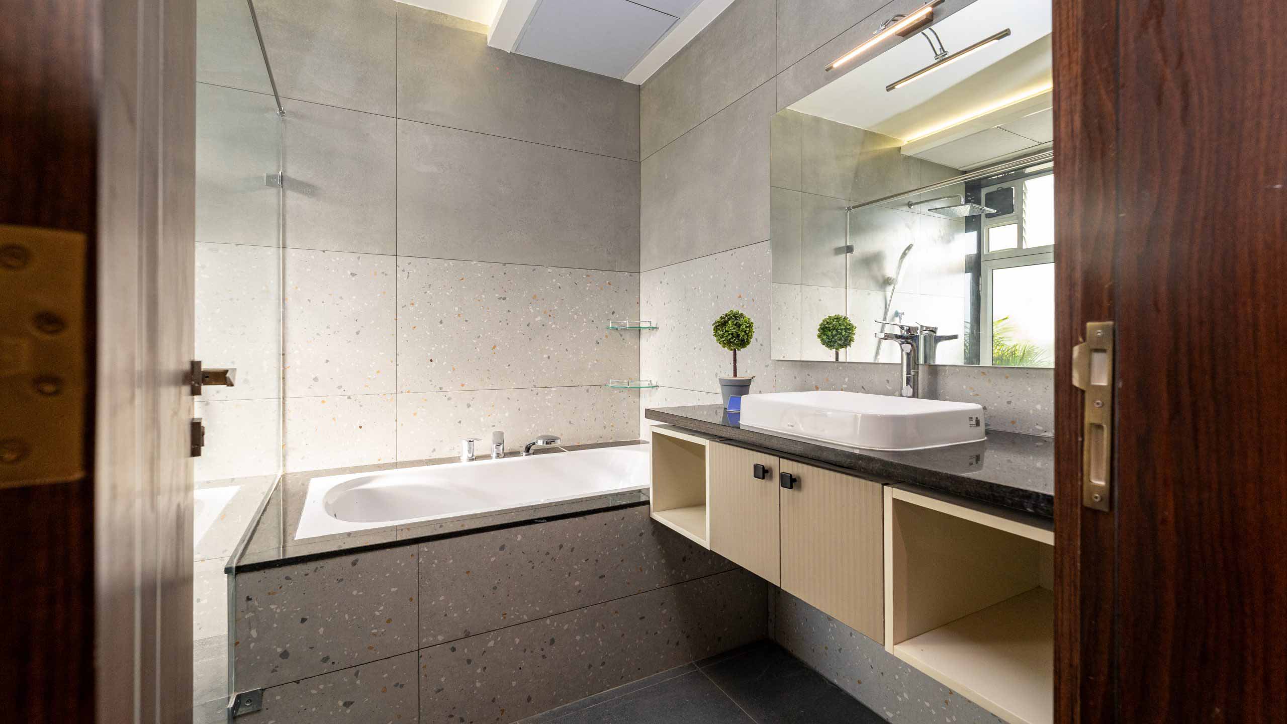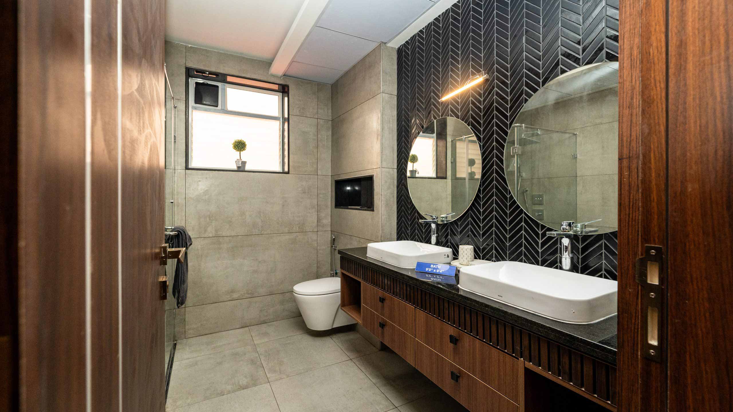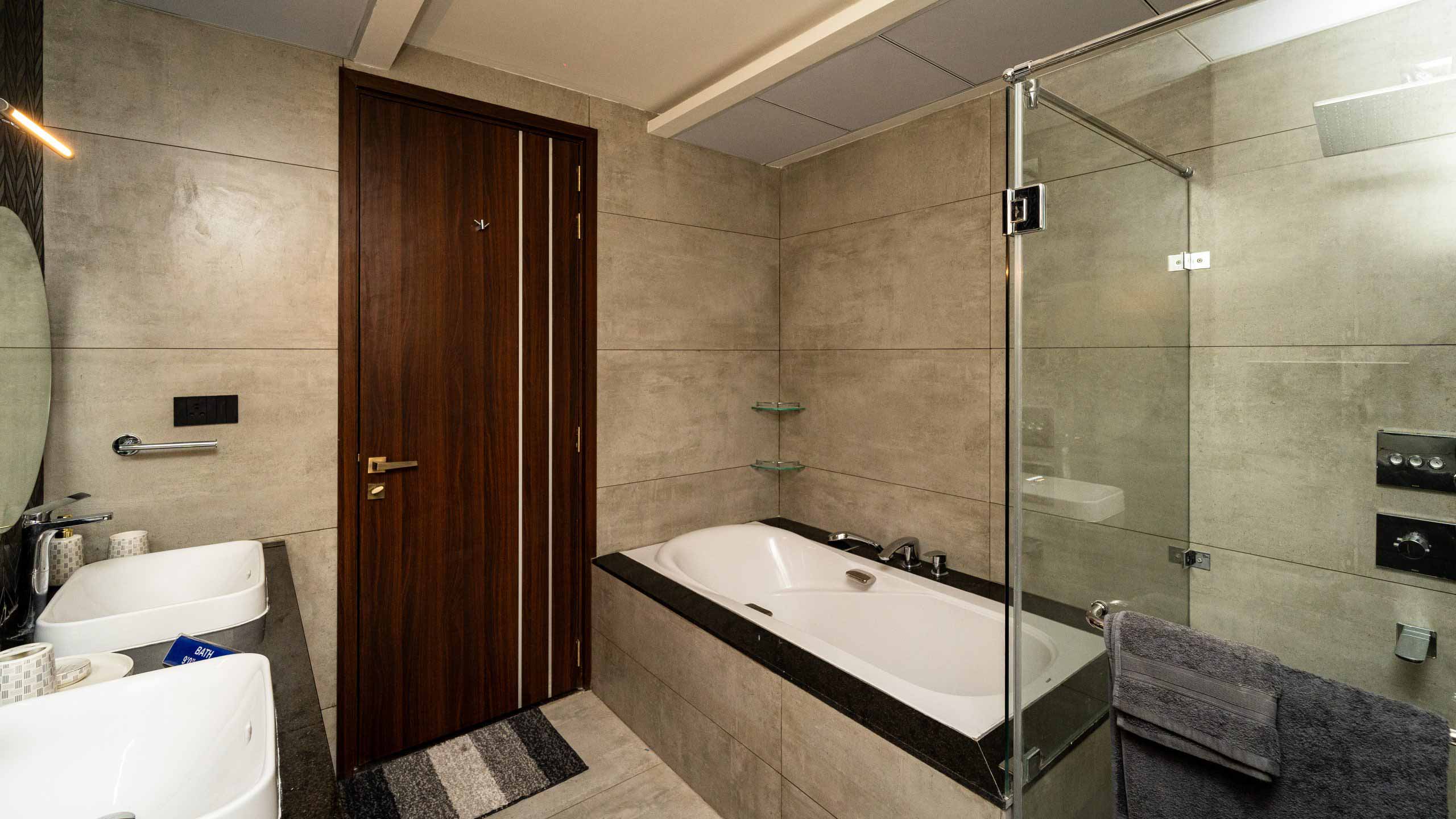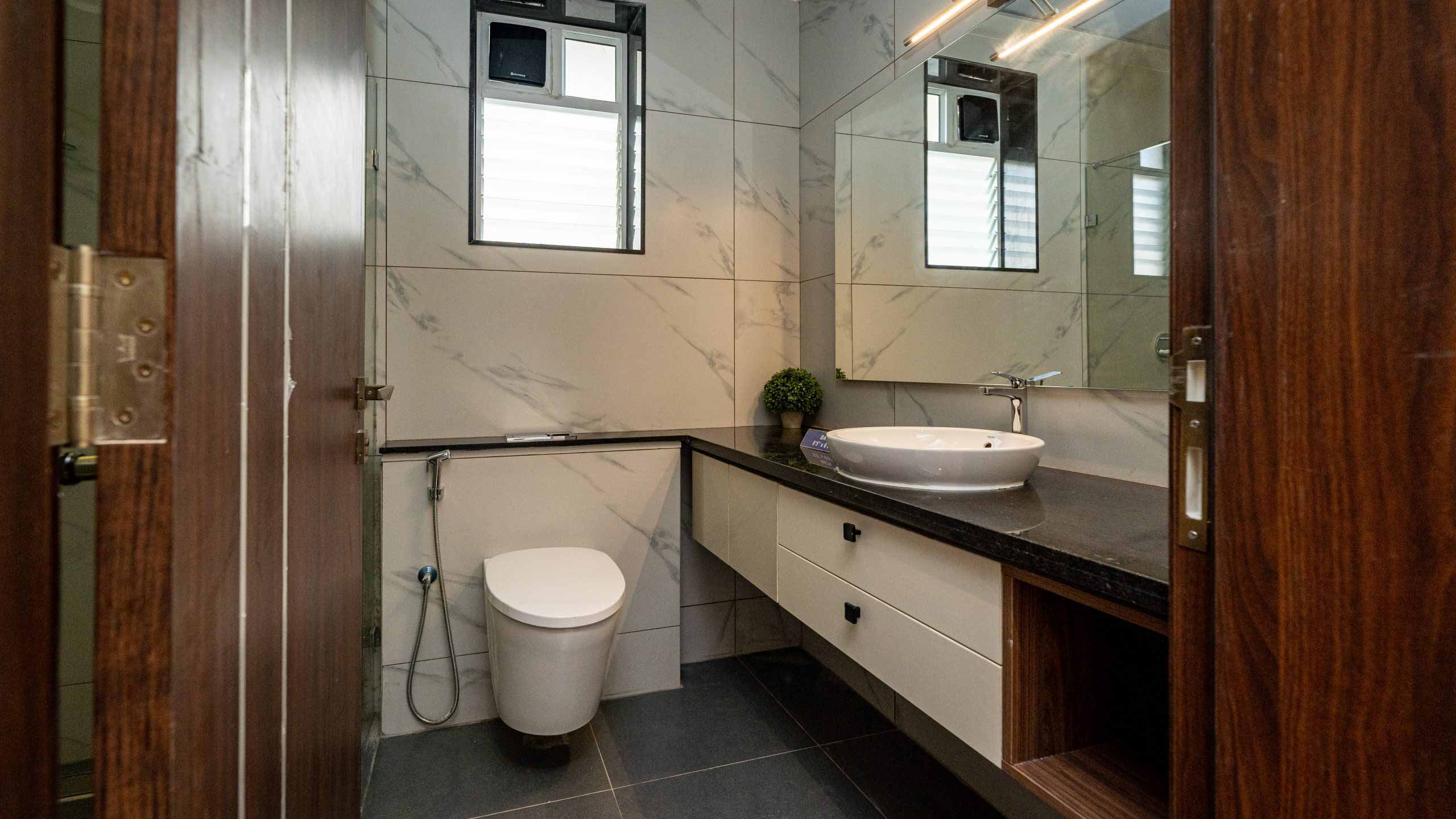 Bathroom doors : Full Jamb engineered frame with double side laminated shutter of size 900x2400mm with waterproofing on inner side.