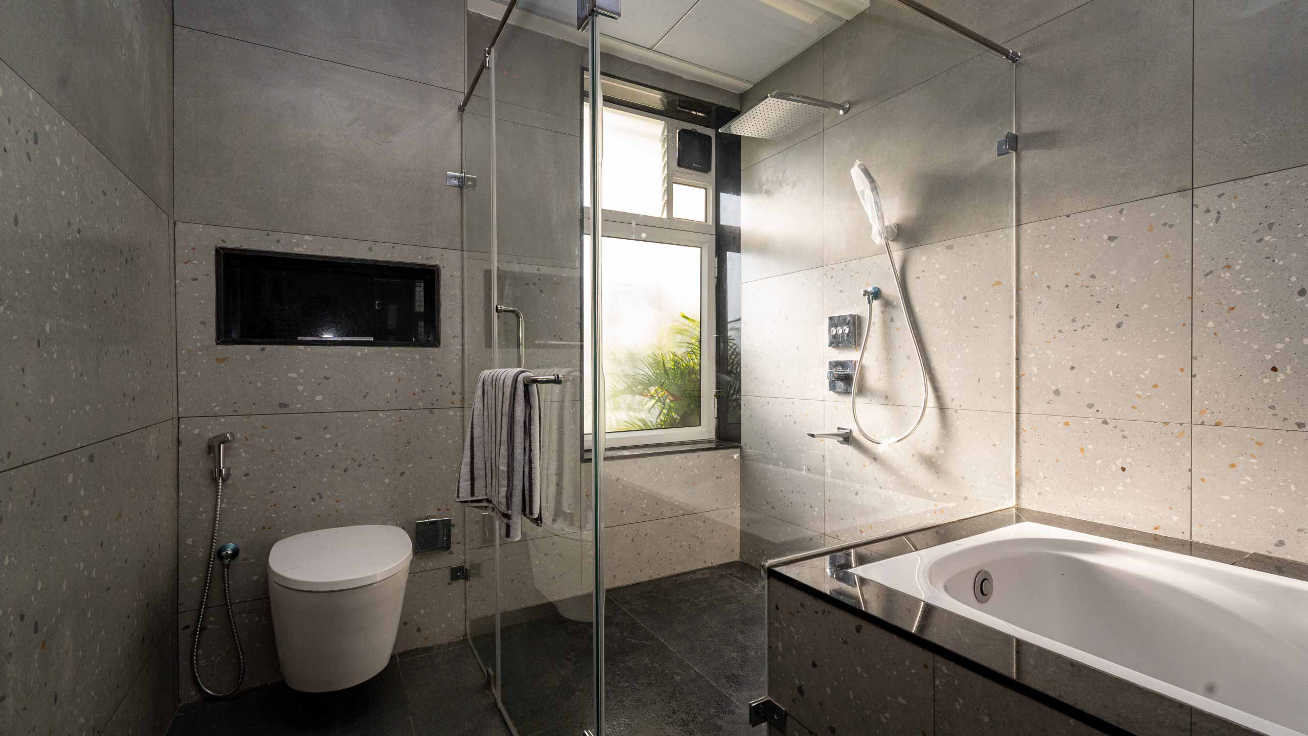 Master Bathroom : Wall mounted WC with cistern, Health faucet, Single lever diverter with rain shower and hand shower, countertop wash basin, 2’ trench drain and Openable glass partition
