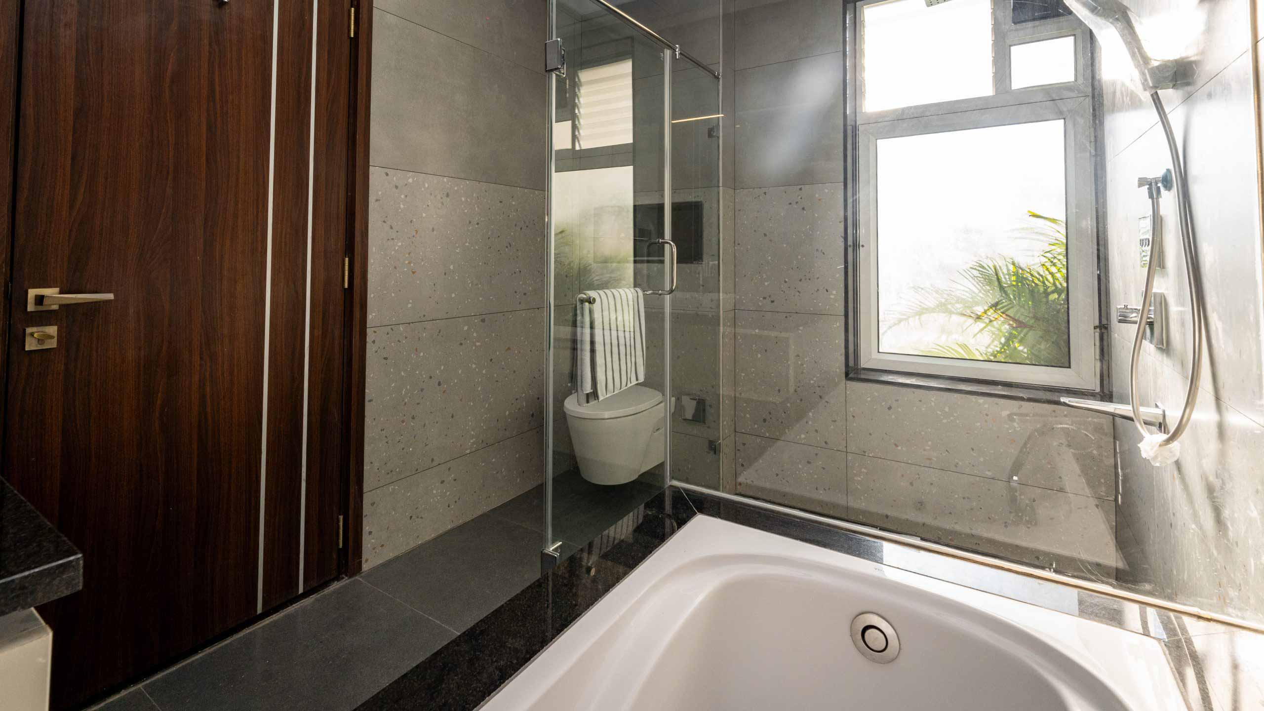 Bathroom 1,2 : Wall mounted WC with cistern, Health faucet, 3-way diverter with Thermostat control Panel, Rain shower with hand shower, Bathtub, Granite countertop wash basin, Shower area with granite flooring, Glass shower cubicle & 2’ trench drain.