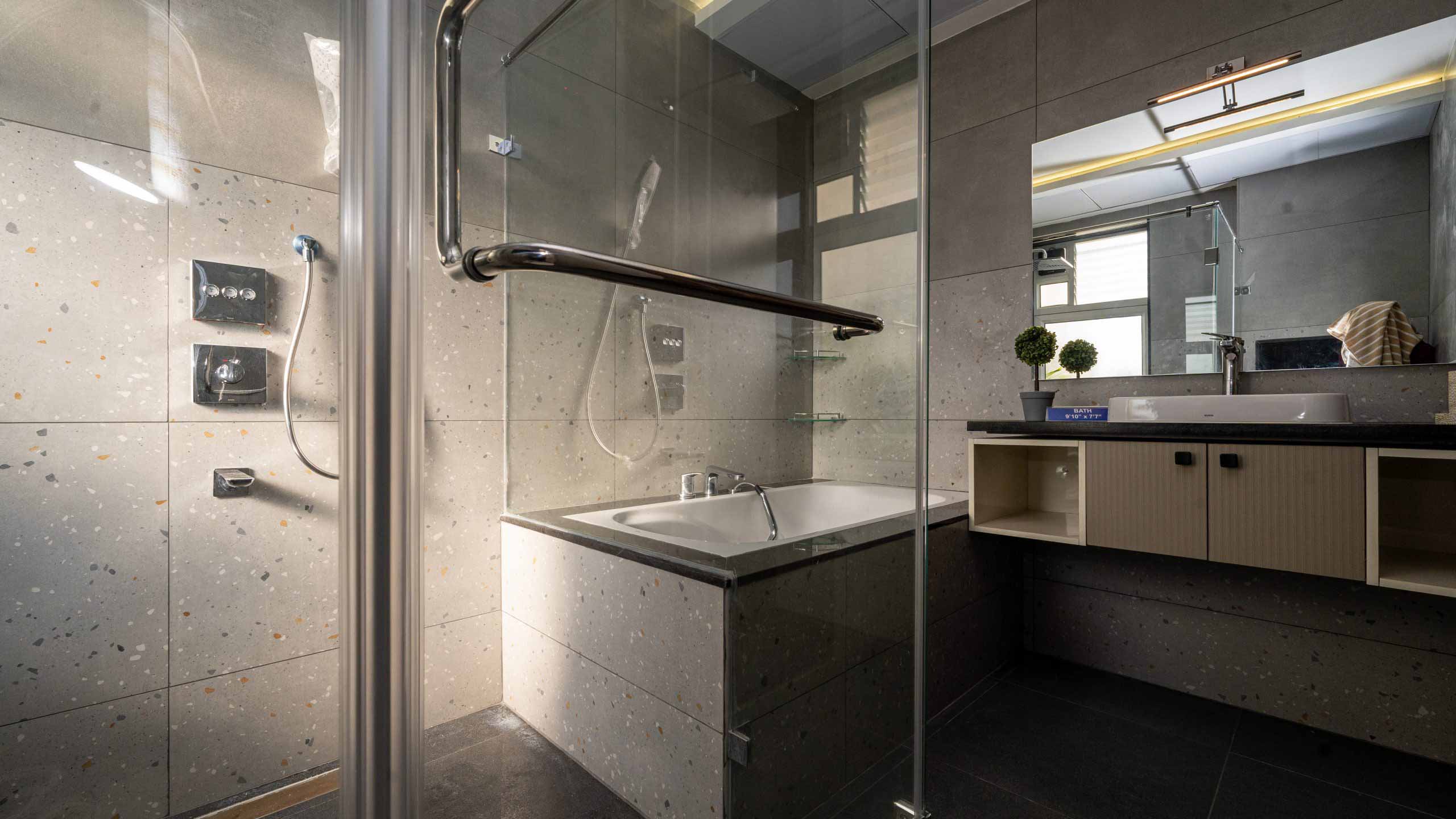 with Rain shower and Granite Counter with countertop wash basin, Shower area with Glass cubical and 2’ trench.