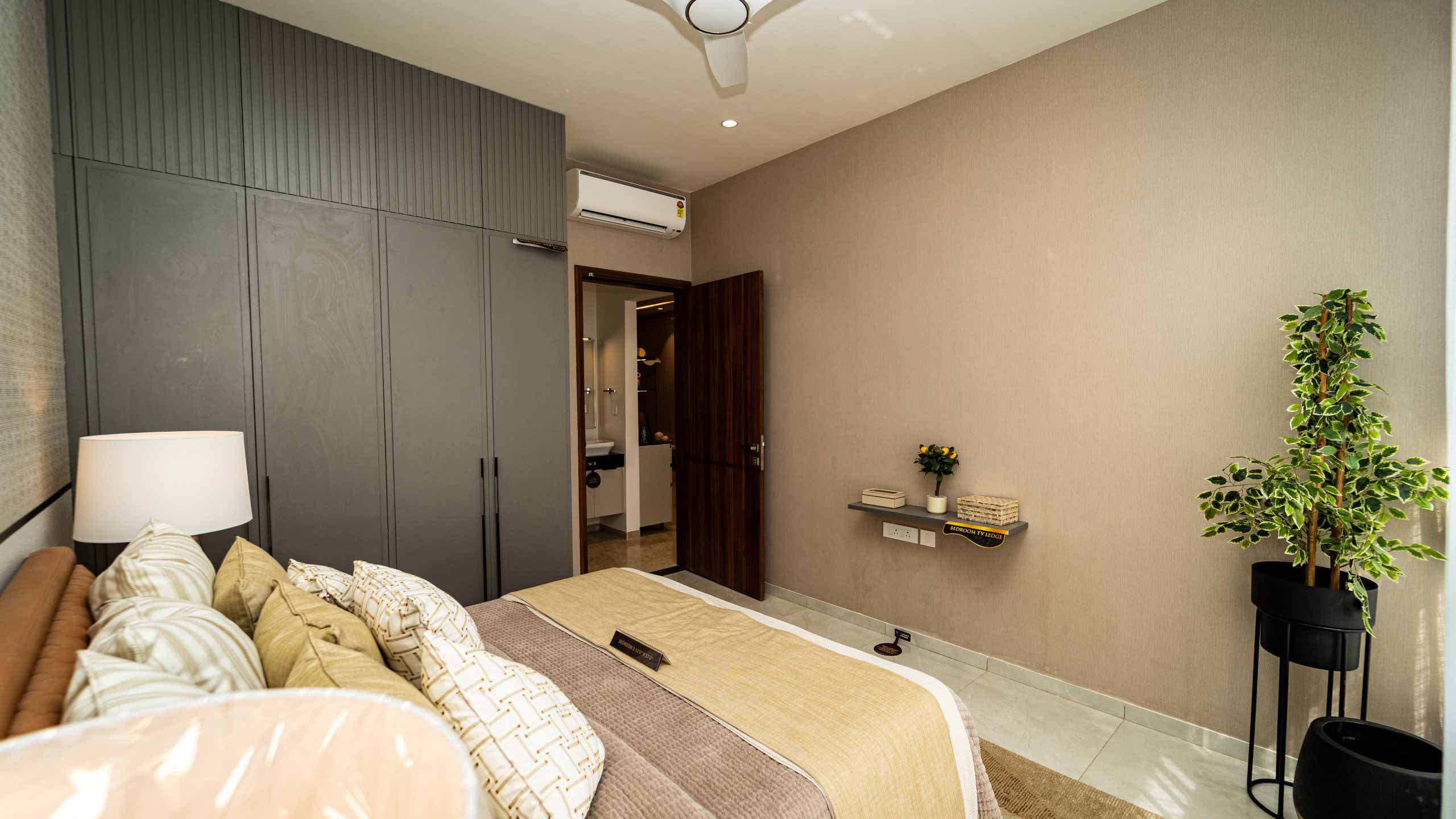 Attached Bathroom : Wall mounted WC with cistern, flush plate and Health faucet, Single lever diverter, rain shower, hand shower and spout with fixed glass partition, granite counter mounted wash basin and 2’ long trench drain
