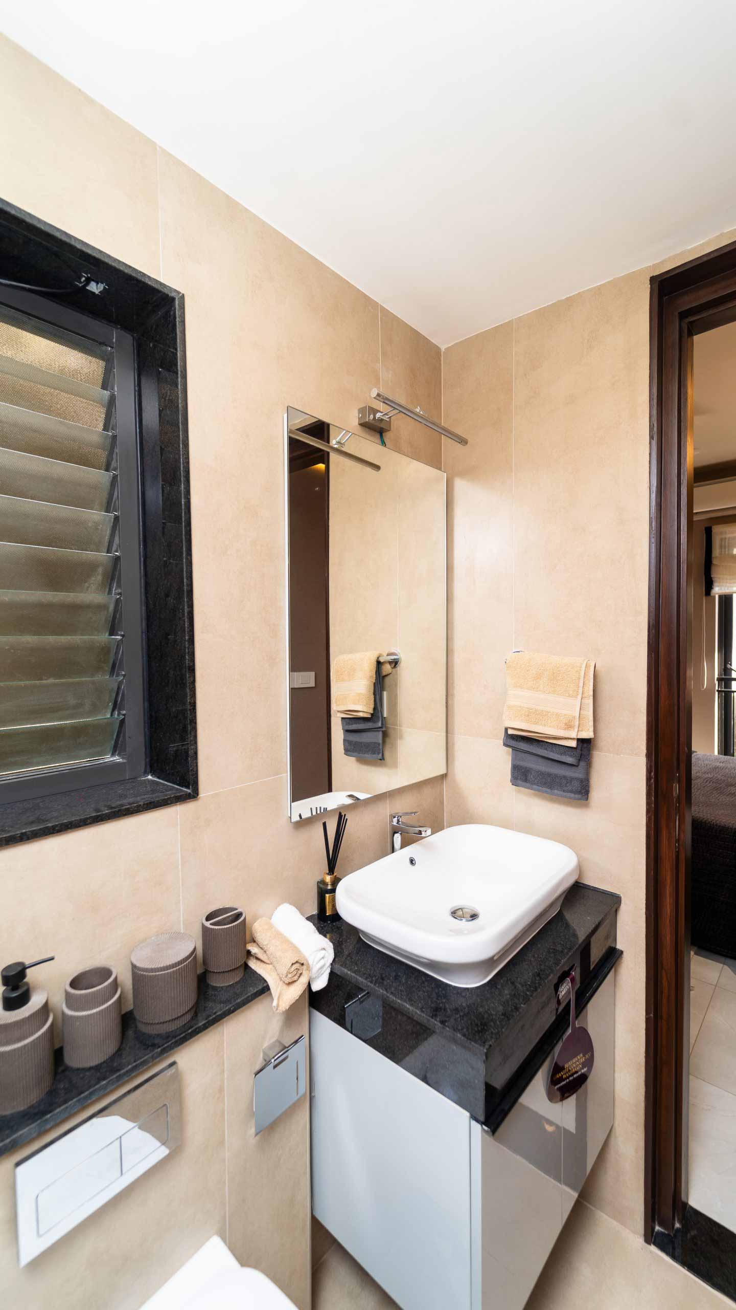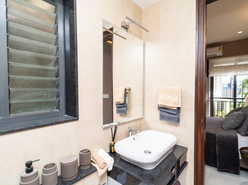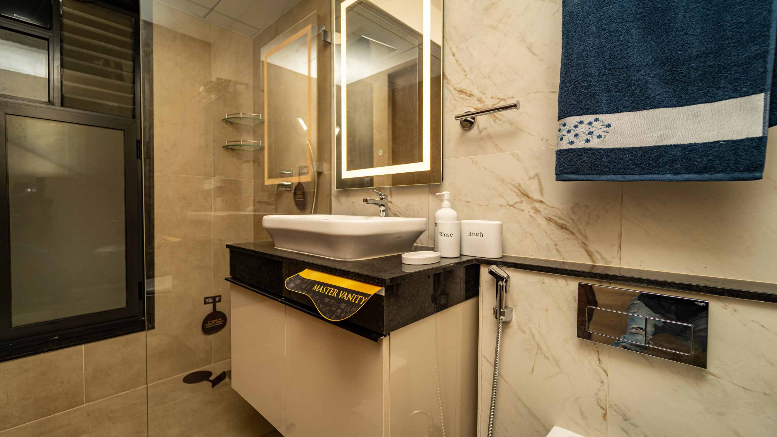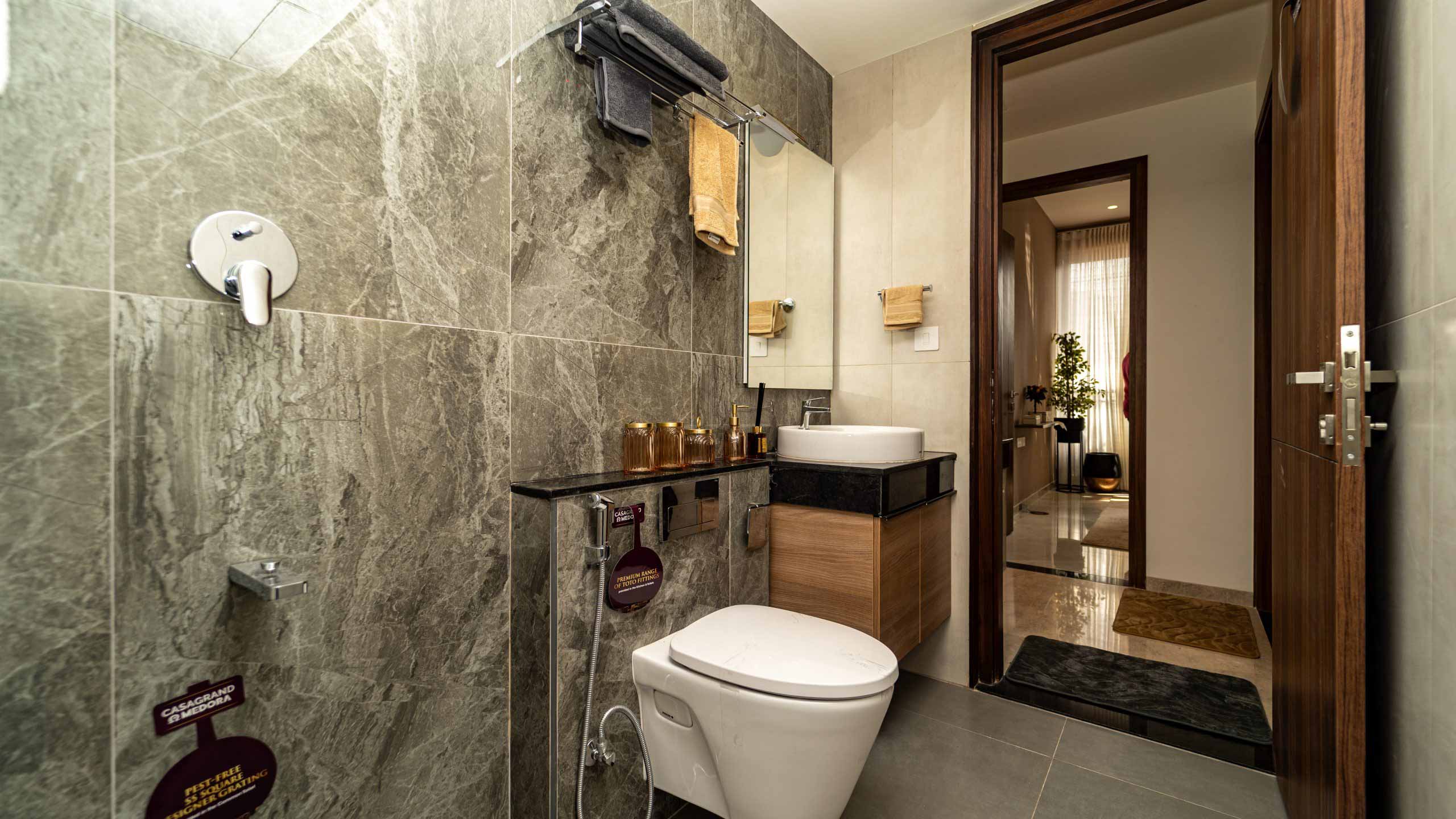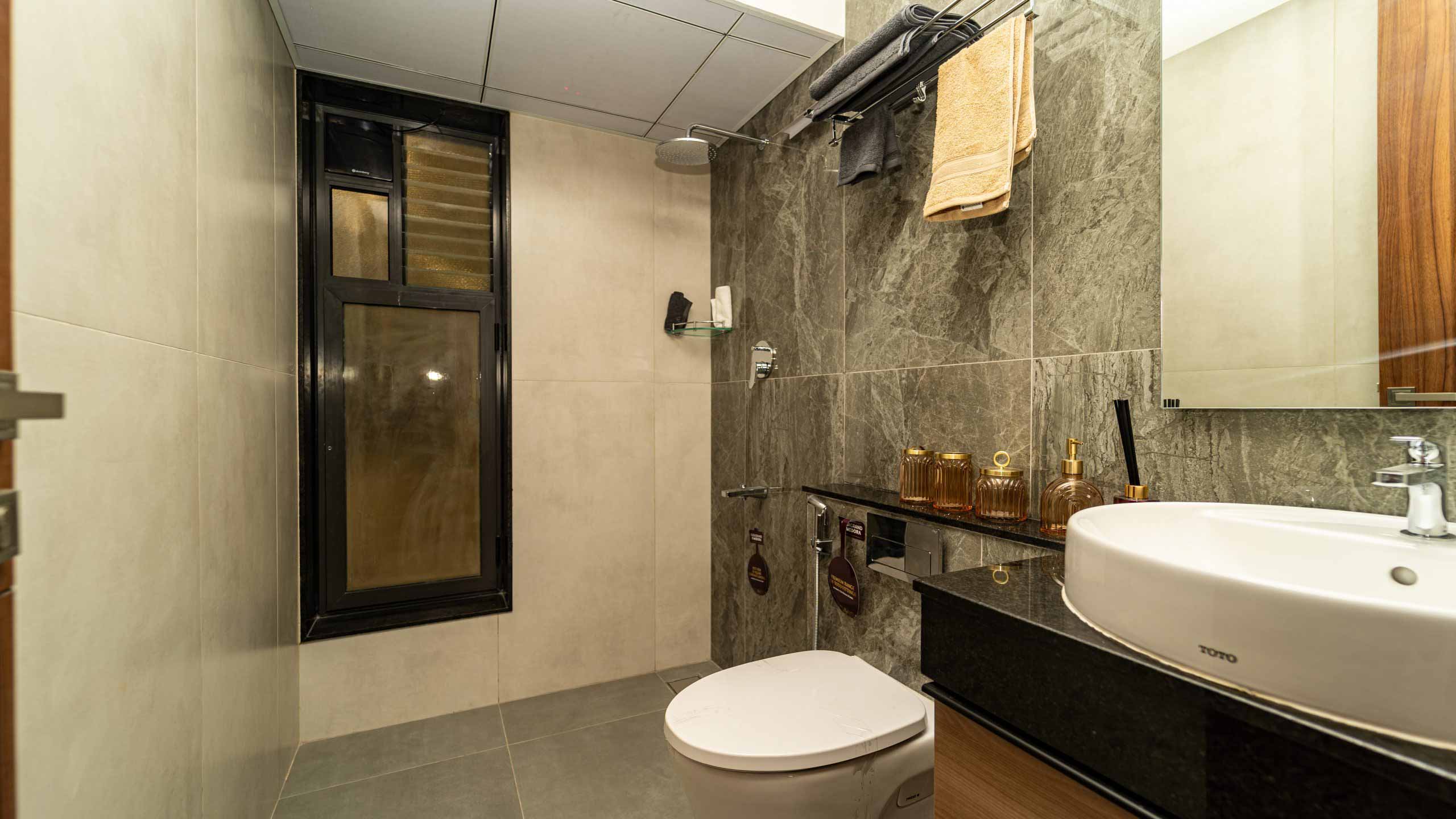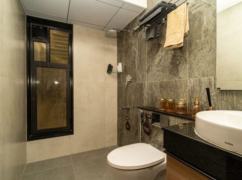 Common Bathrooms : Wall mounted WC with cistern, flush plate and Health faucet, Single lever diverter, rain shower and spout, granite counter mounted wash basin and square designer drain.