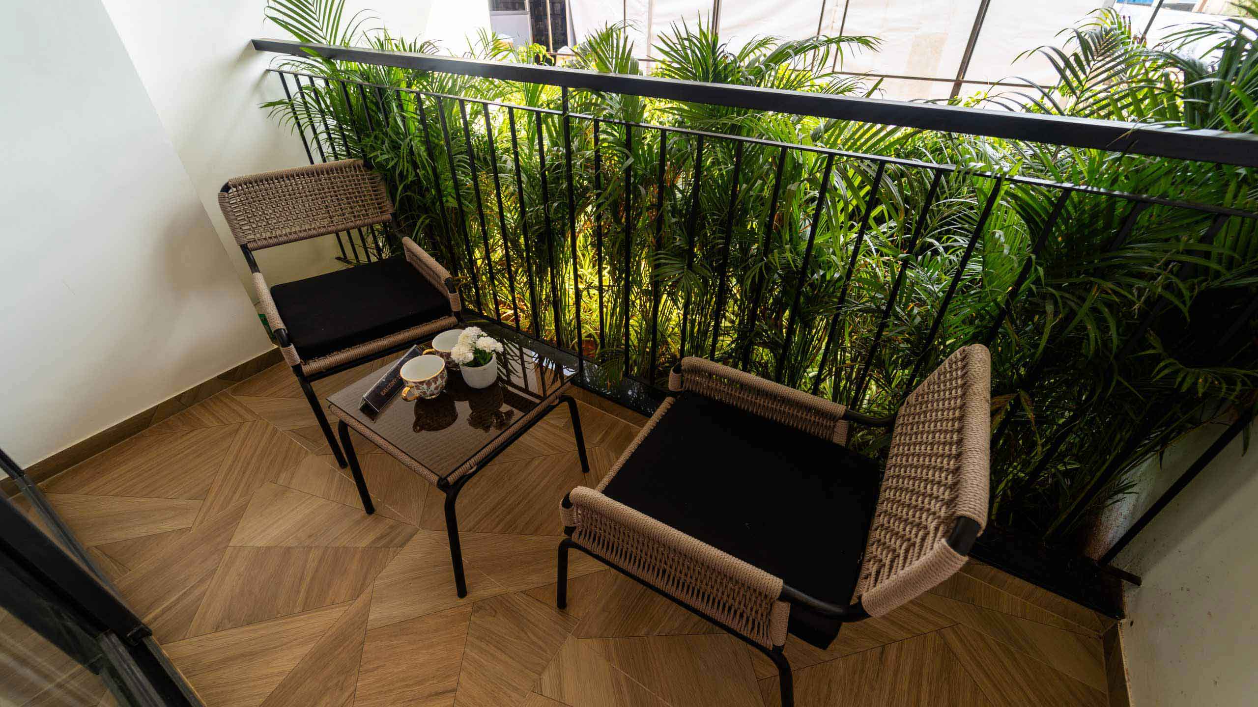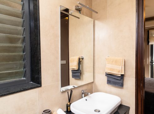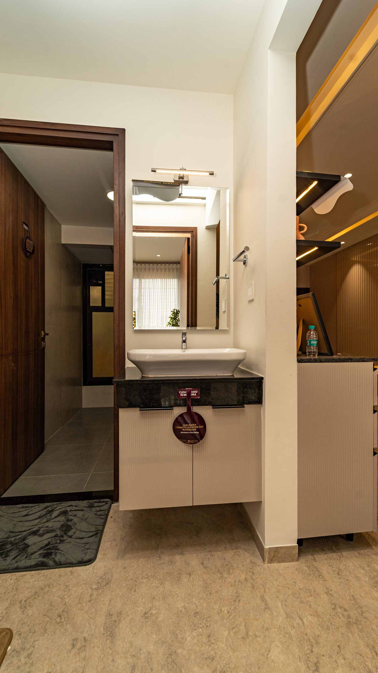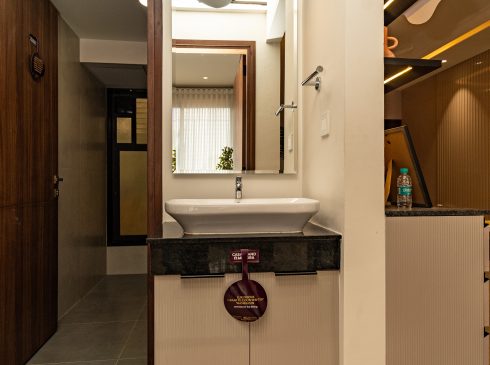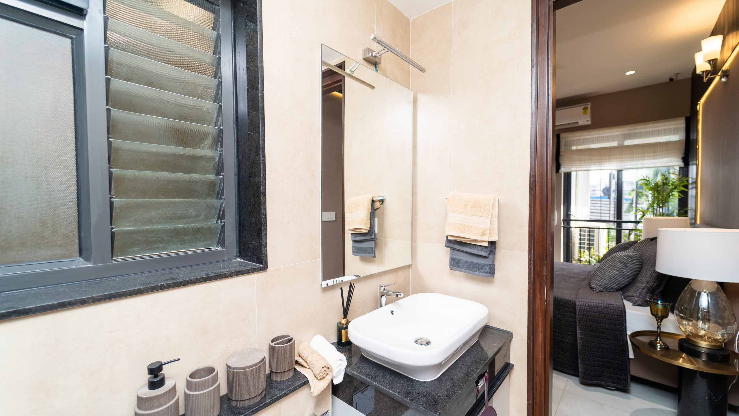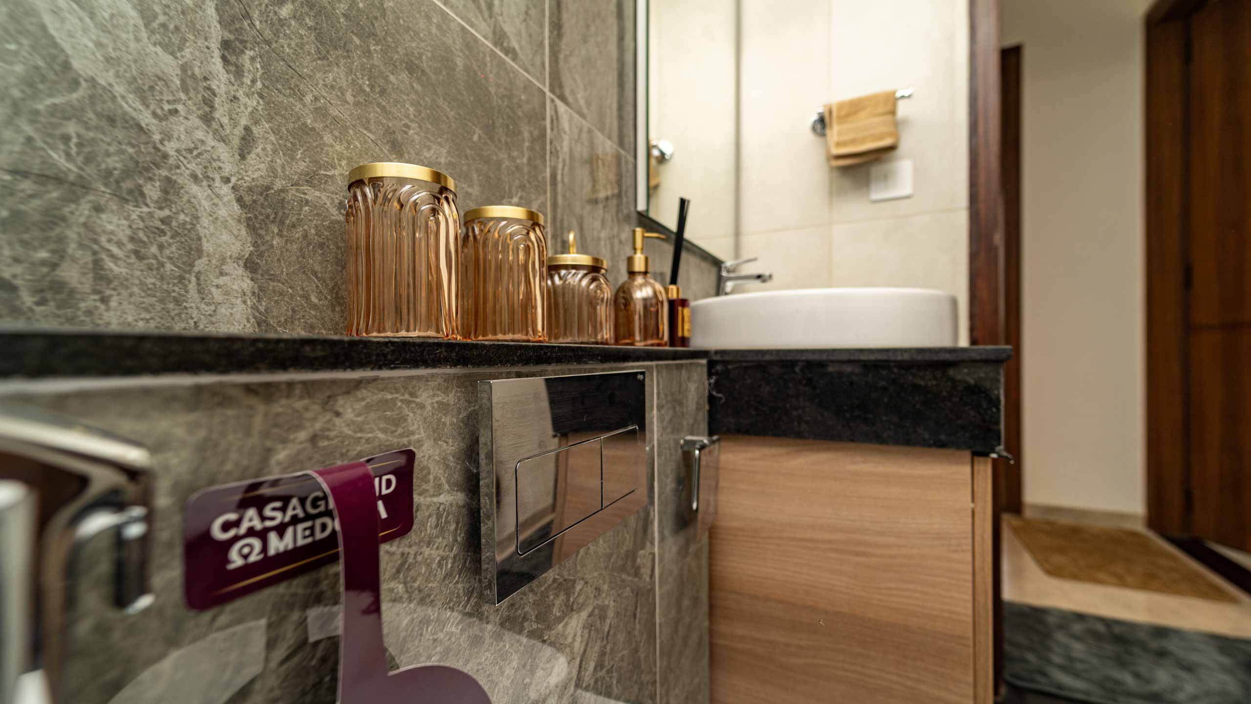 Common Bathrooms : Wall mounted WC with cistern, flush plate and Health faucet, Single lever diverter, rain shower and spout, granite counter mounted wash basin and square designer drain.