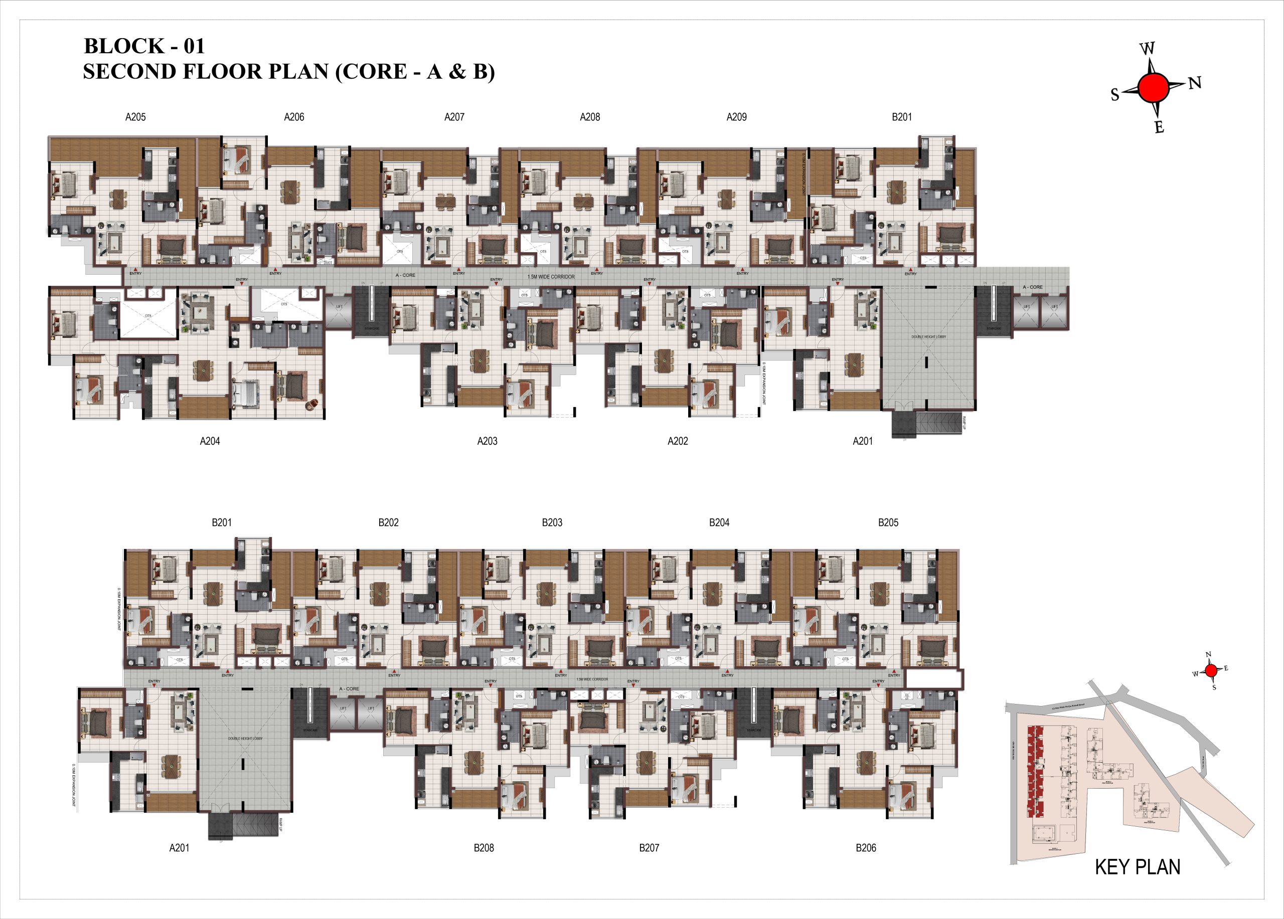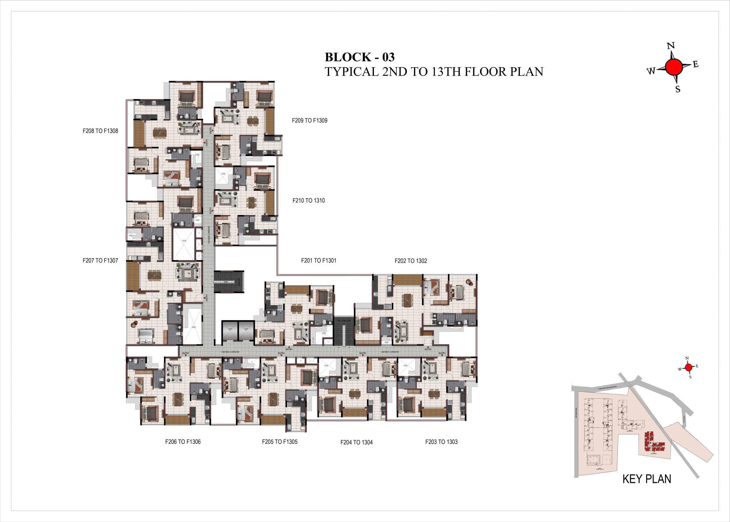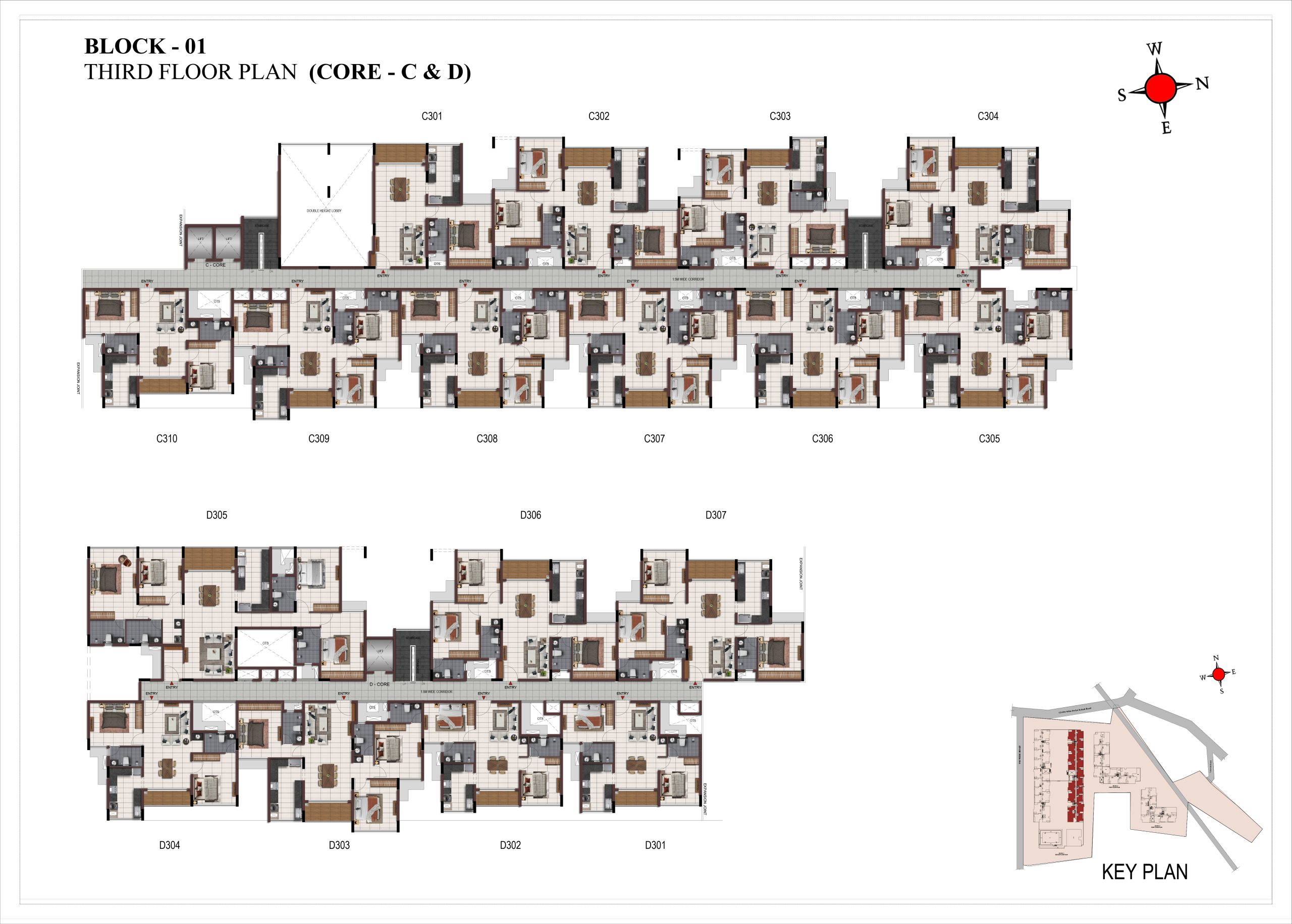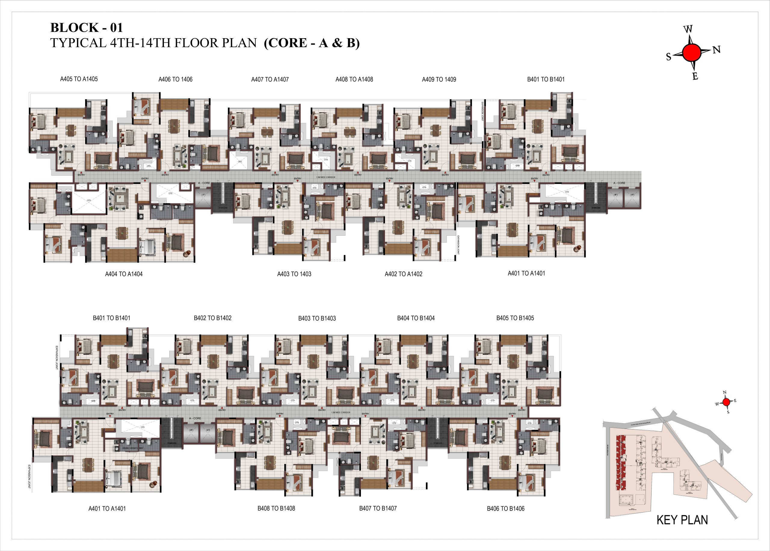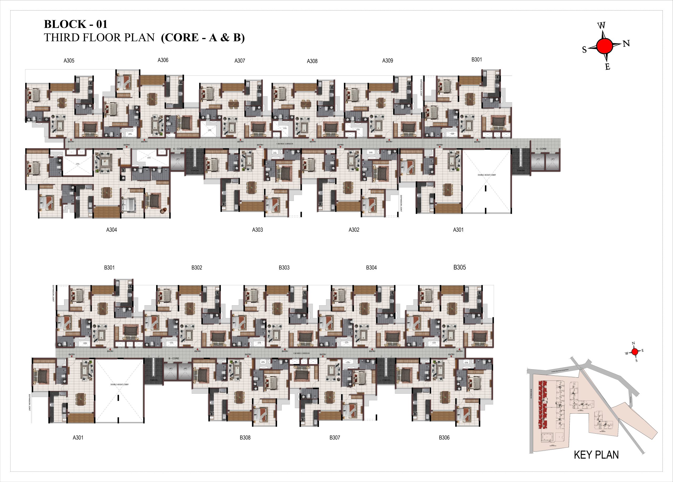 Corridor flooring : Vitrified tile of size 600 × 600mm at all levels