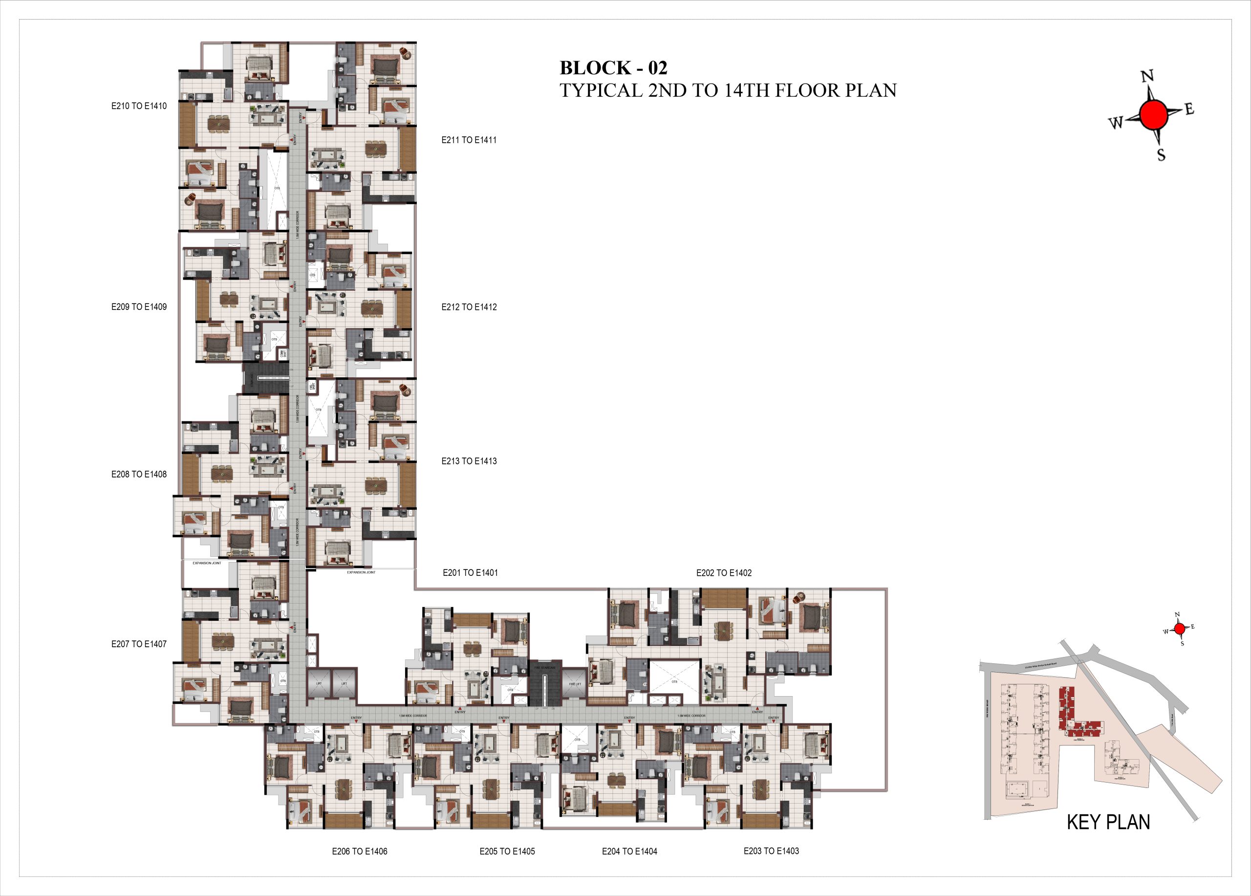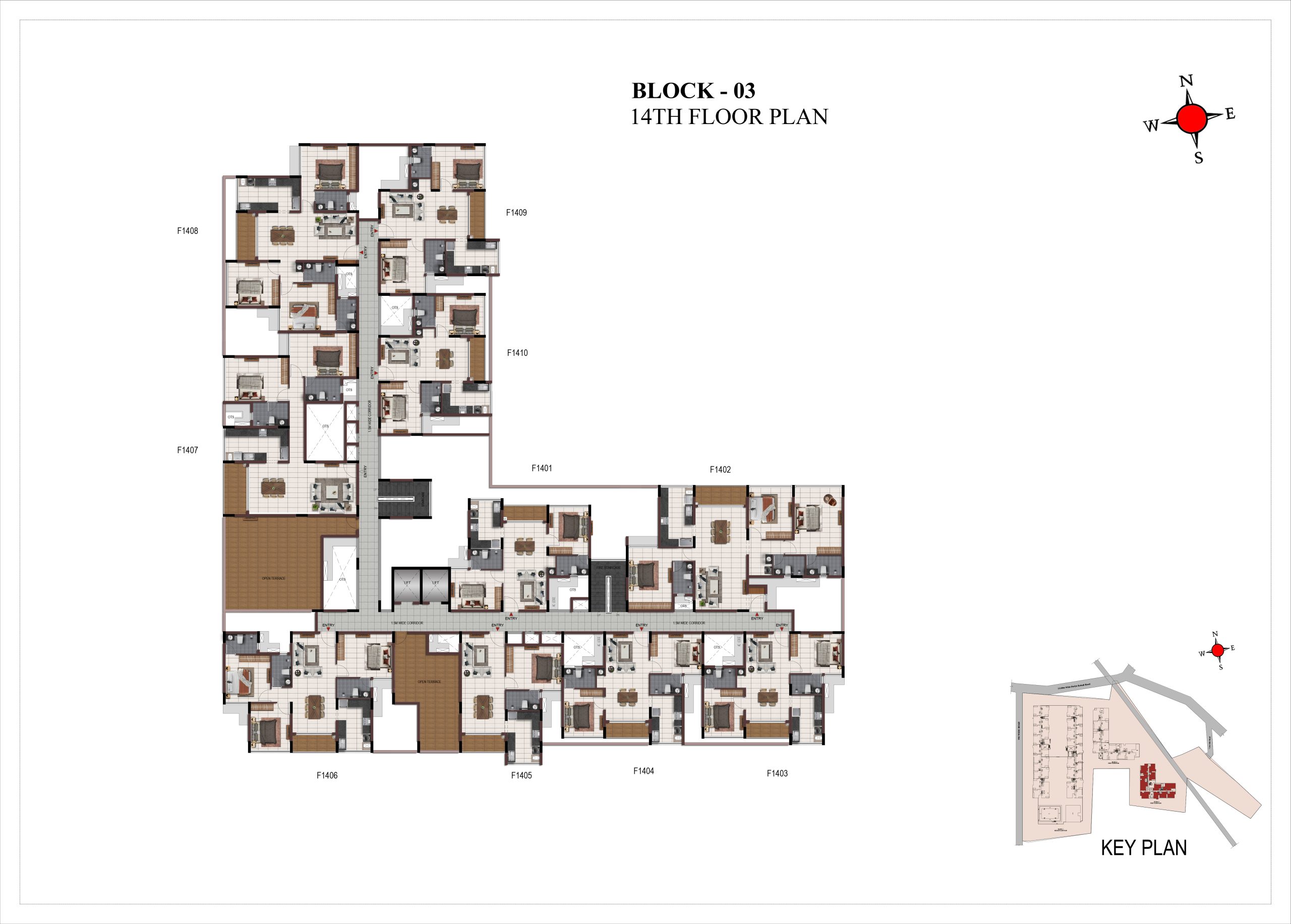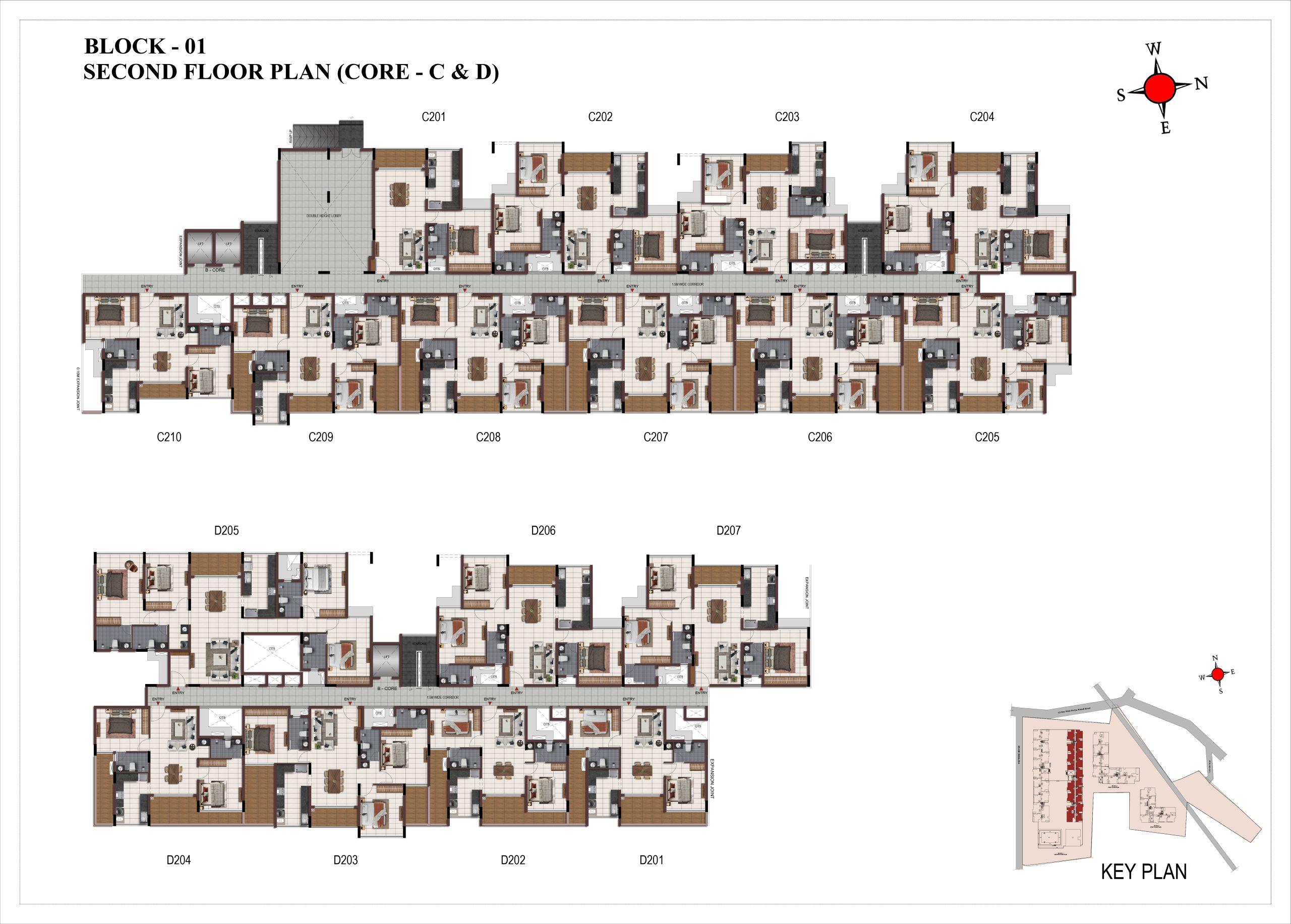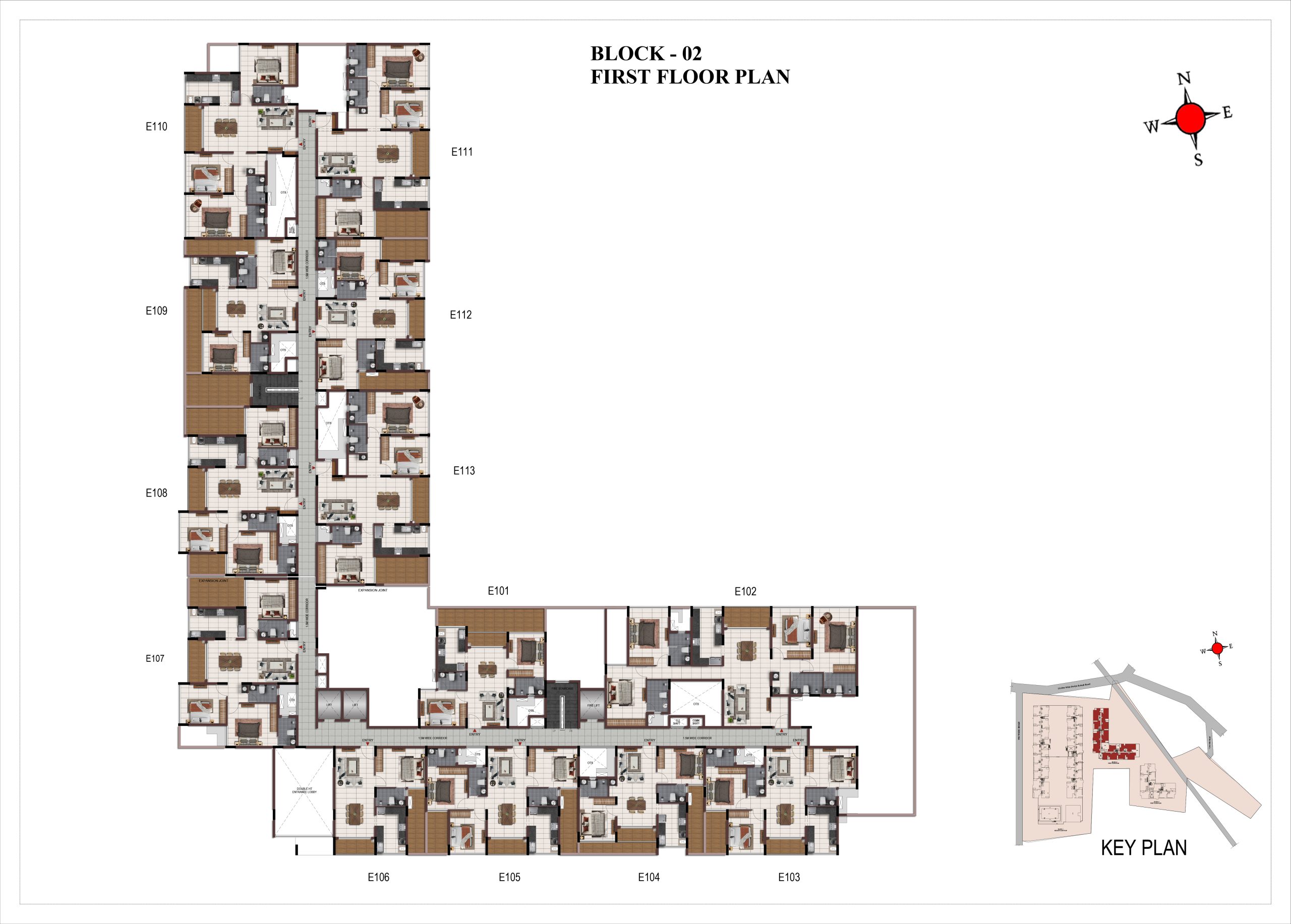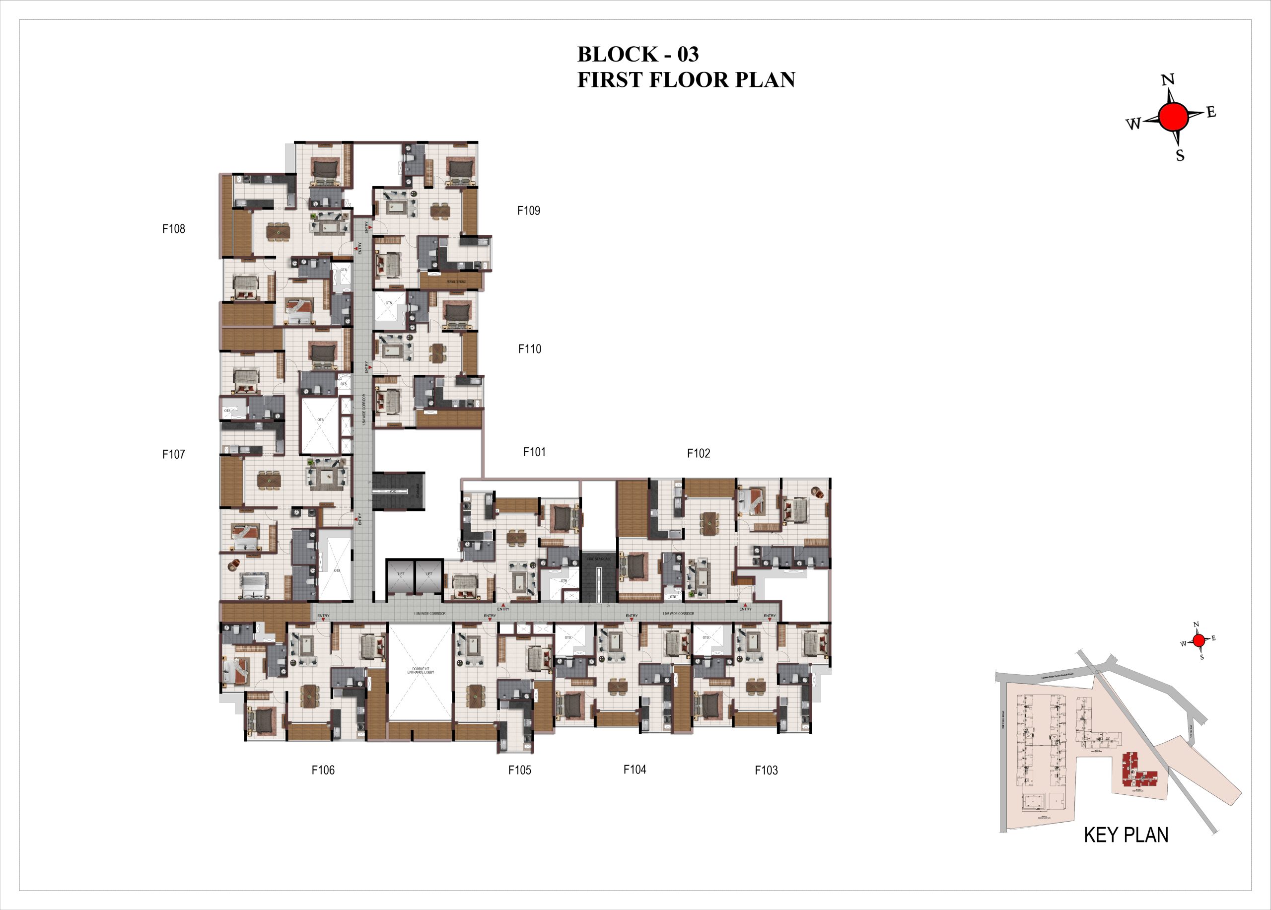 Corridor flooring : Vitrified tile of size 600 × 600mm at all levels