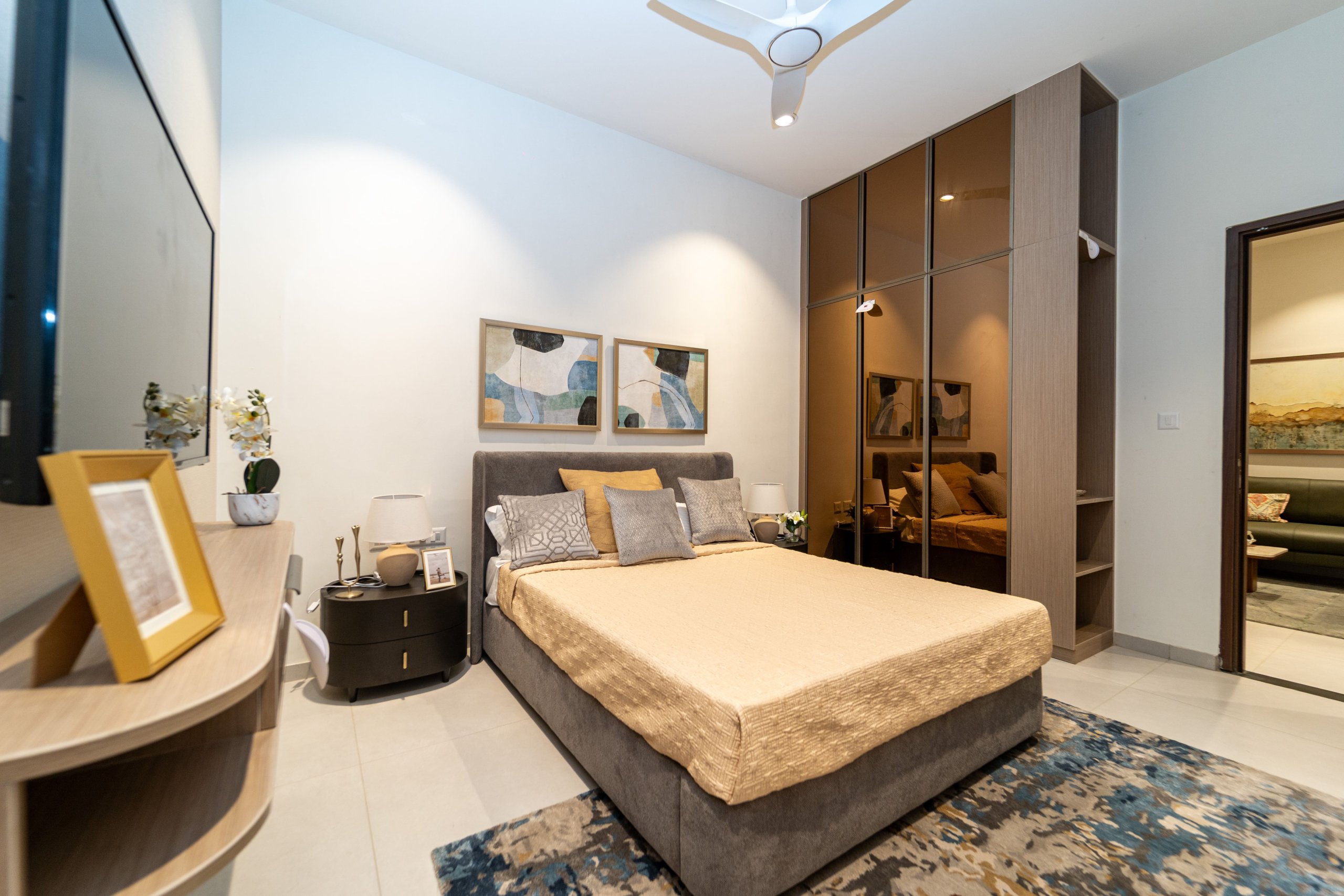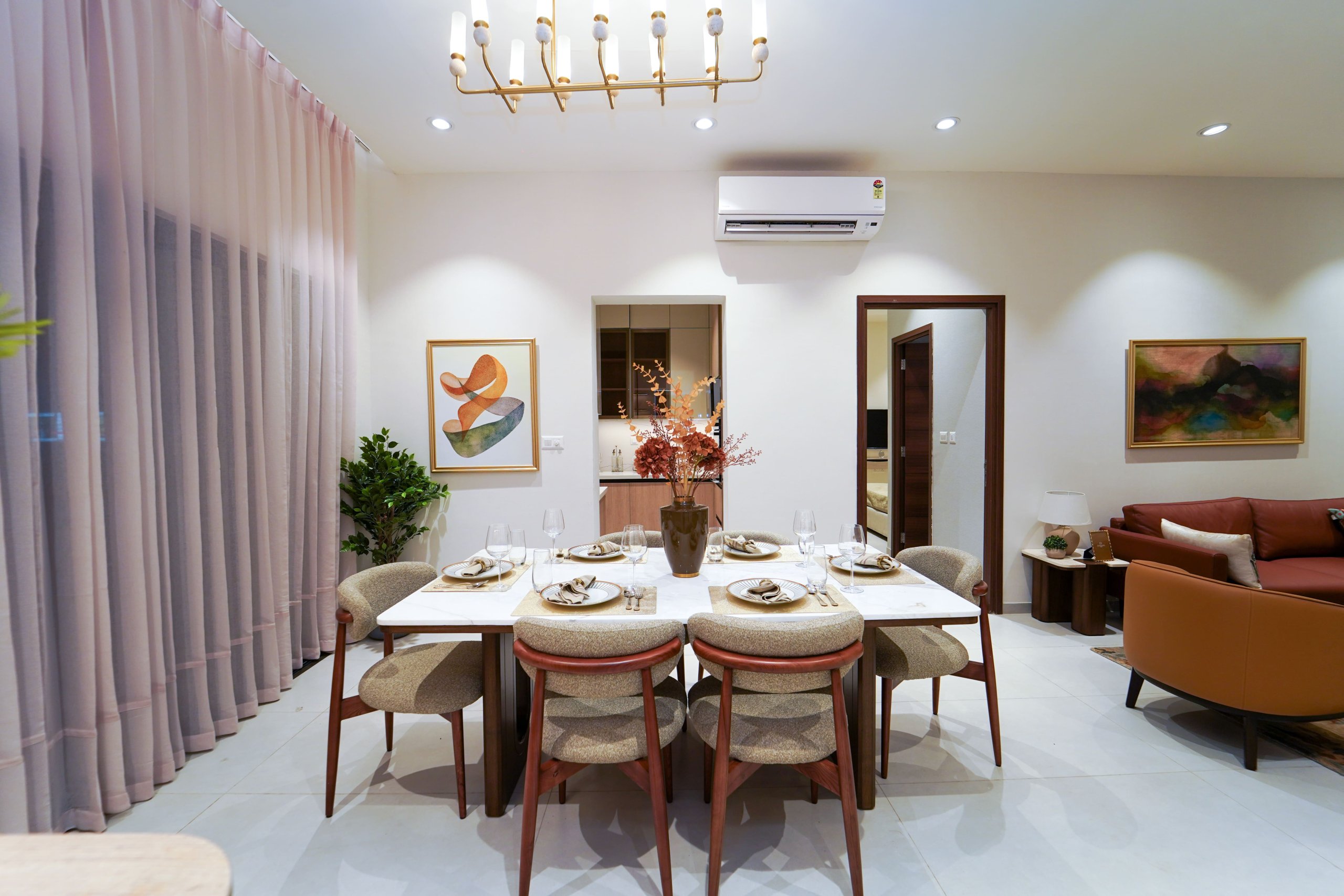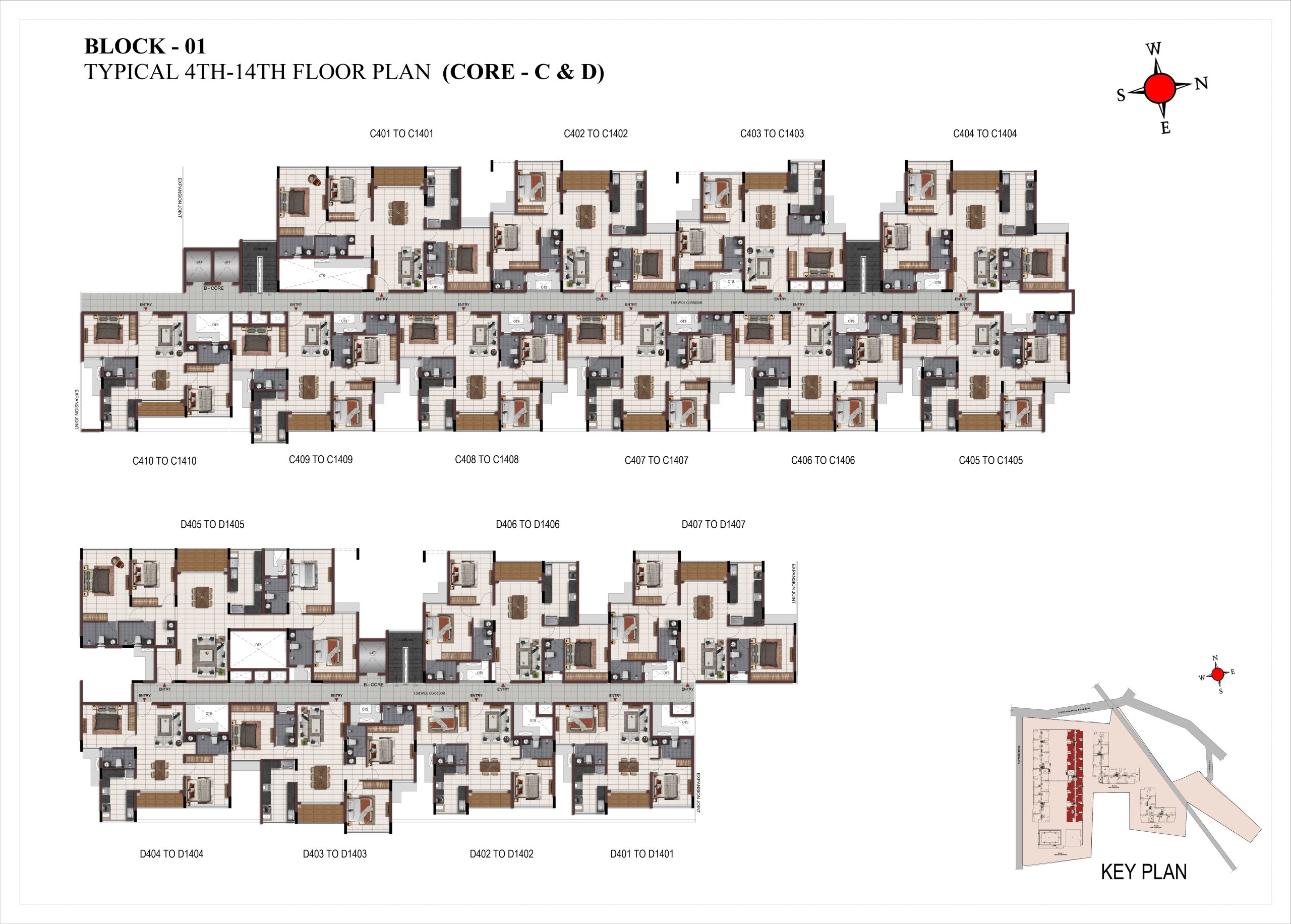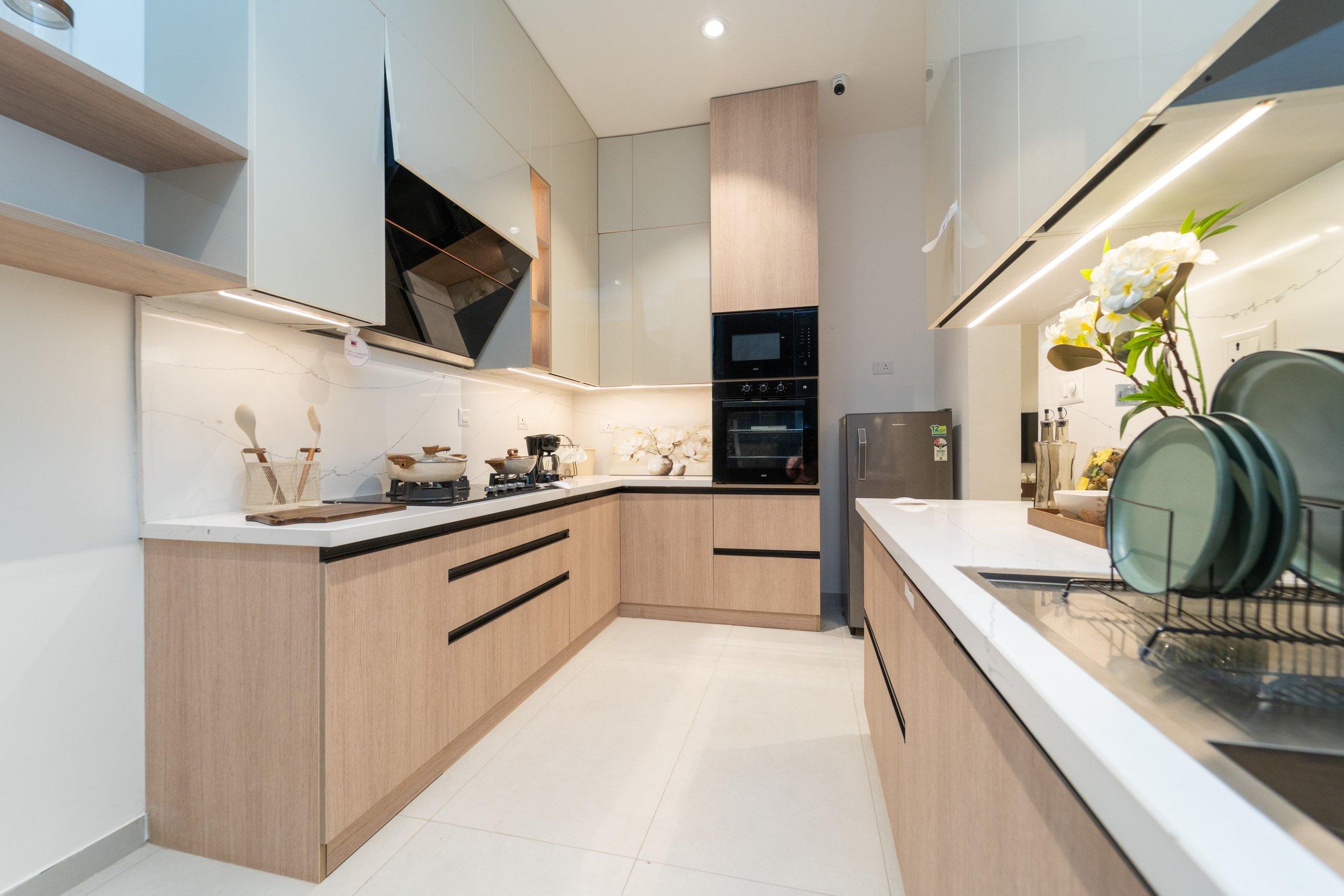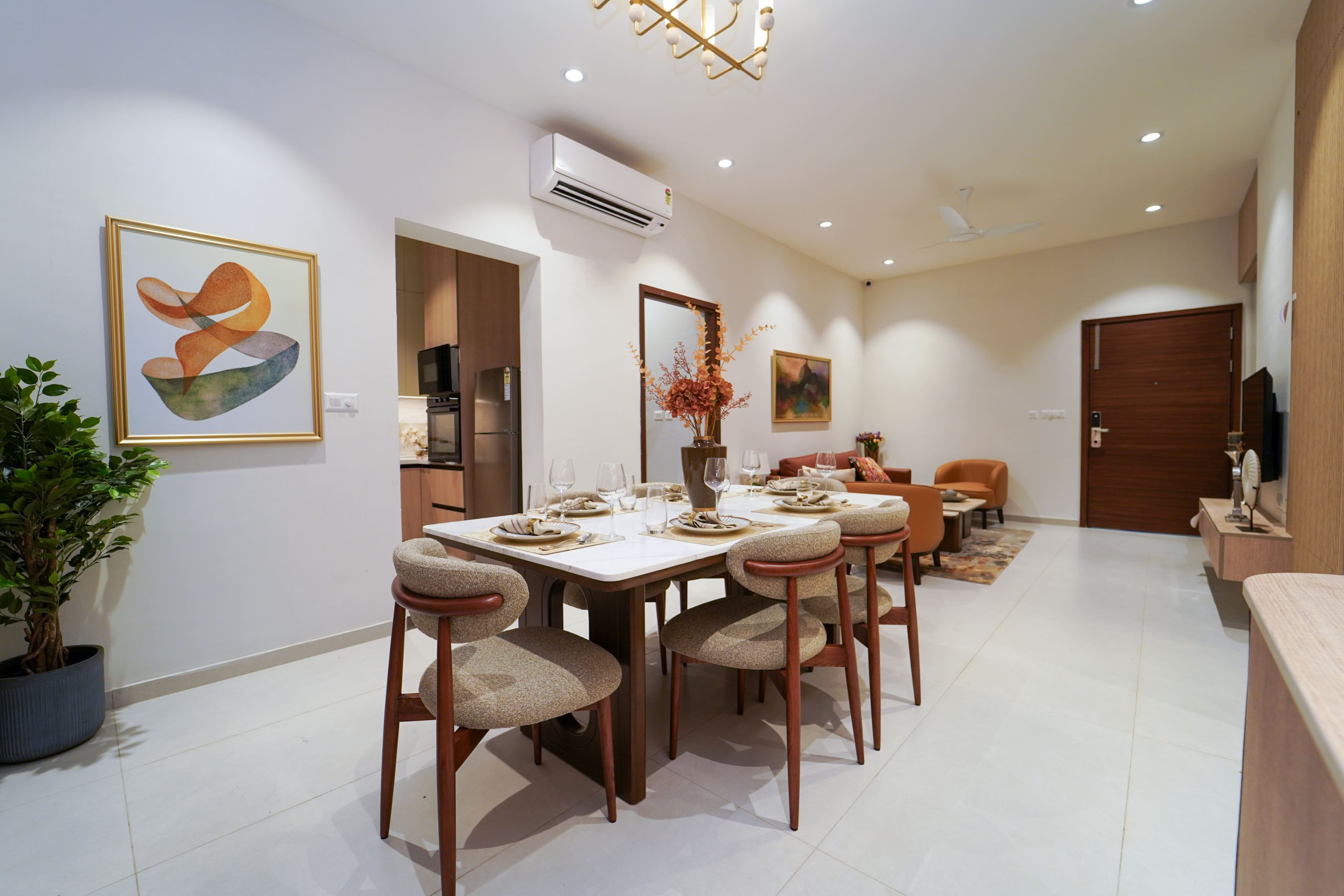 Main flooring (Foyer, Living, Dining, Internal Passage, Kitchen and Bedrooms) : Vitrified tiles of size 1200 × 600mm