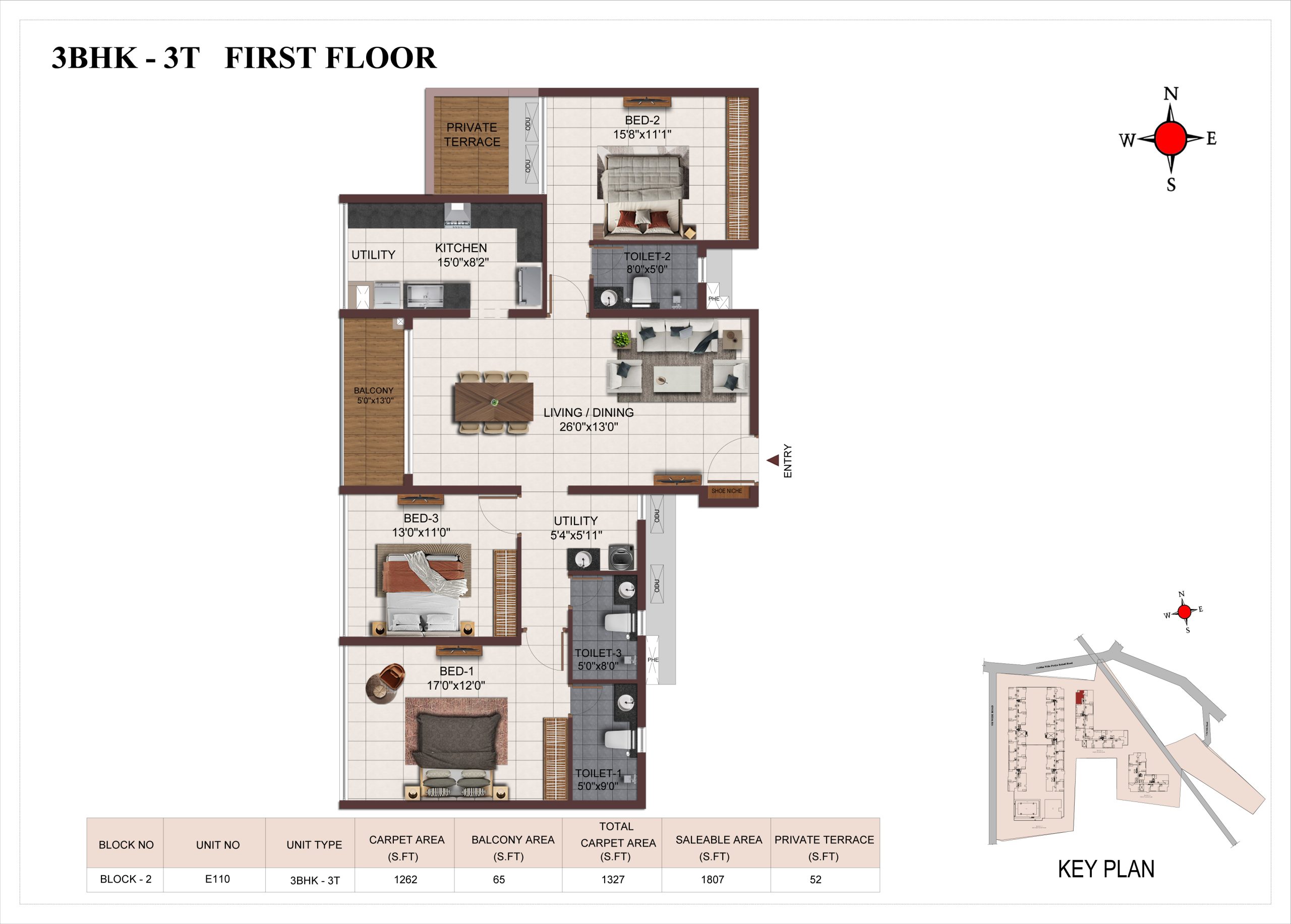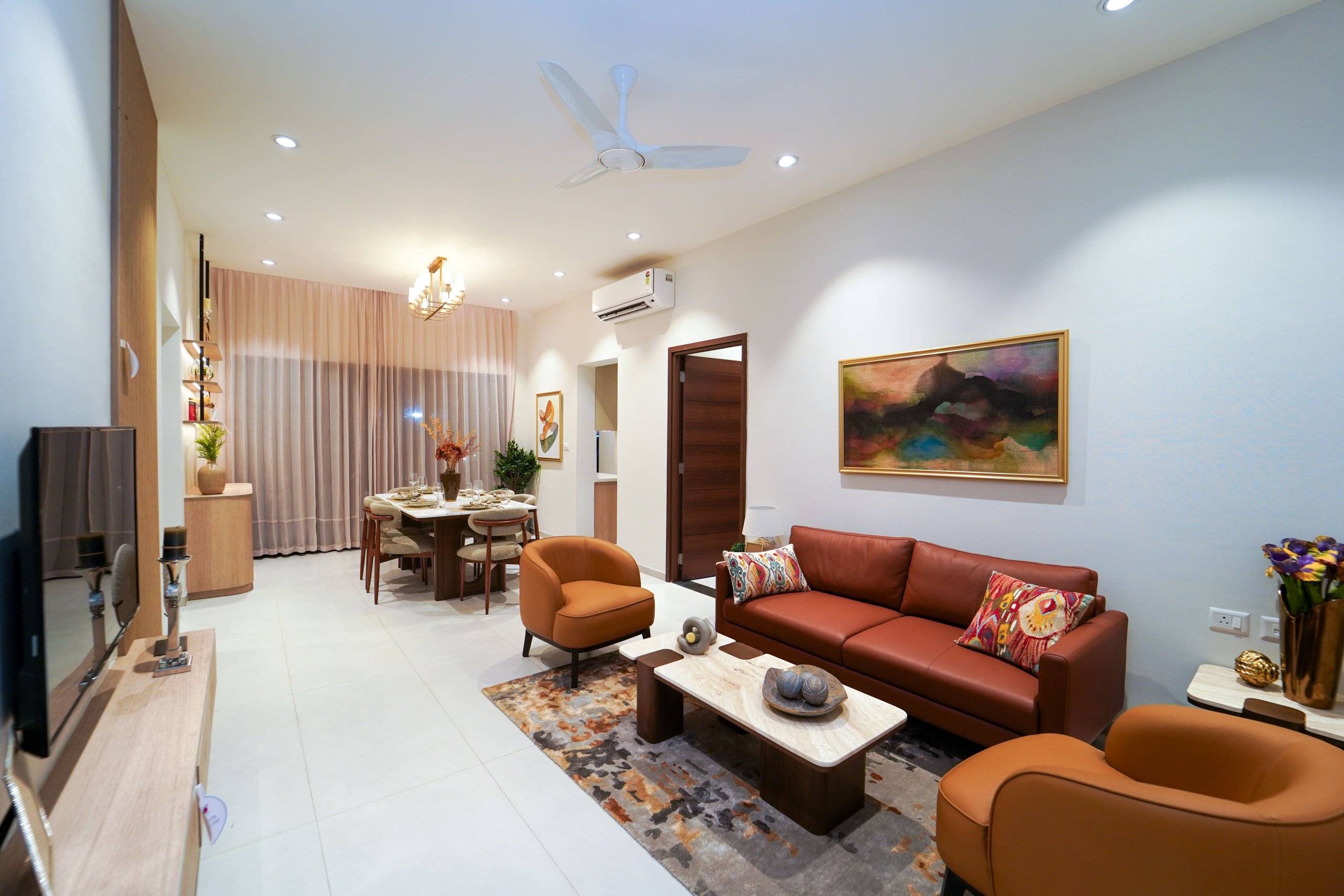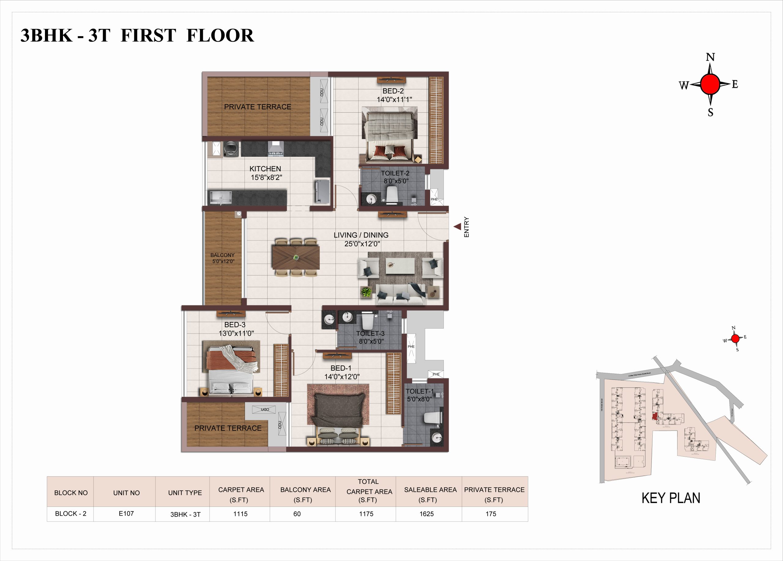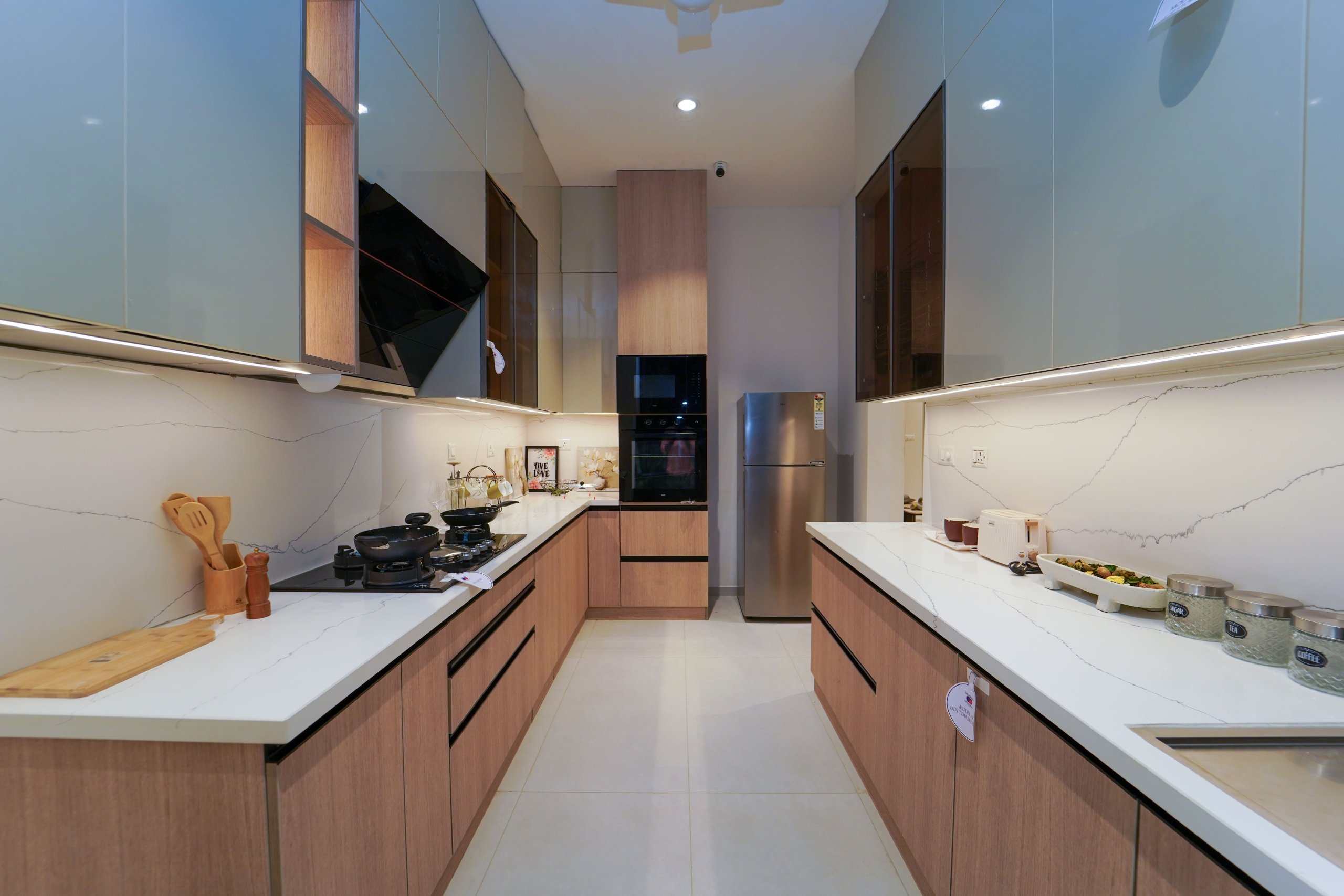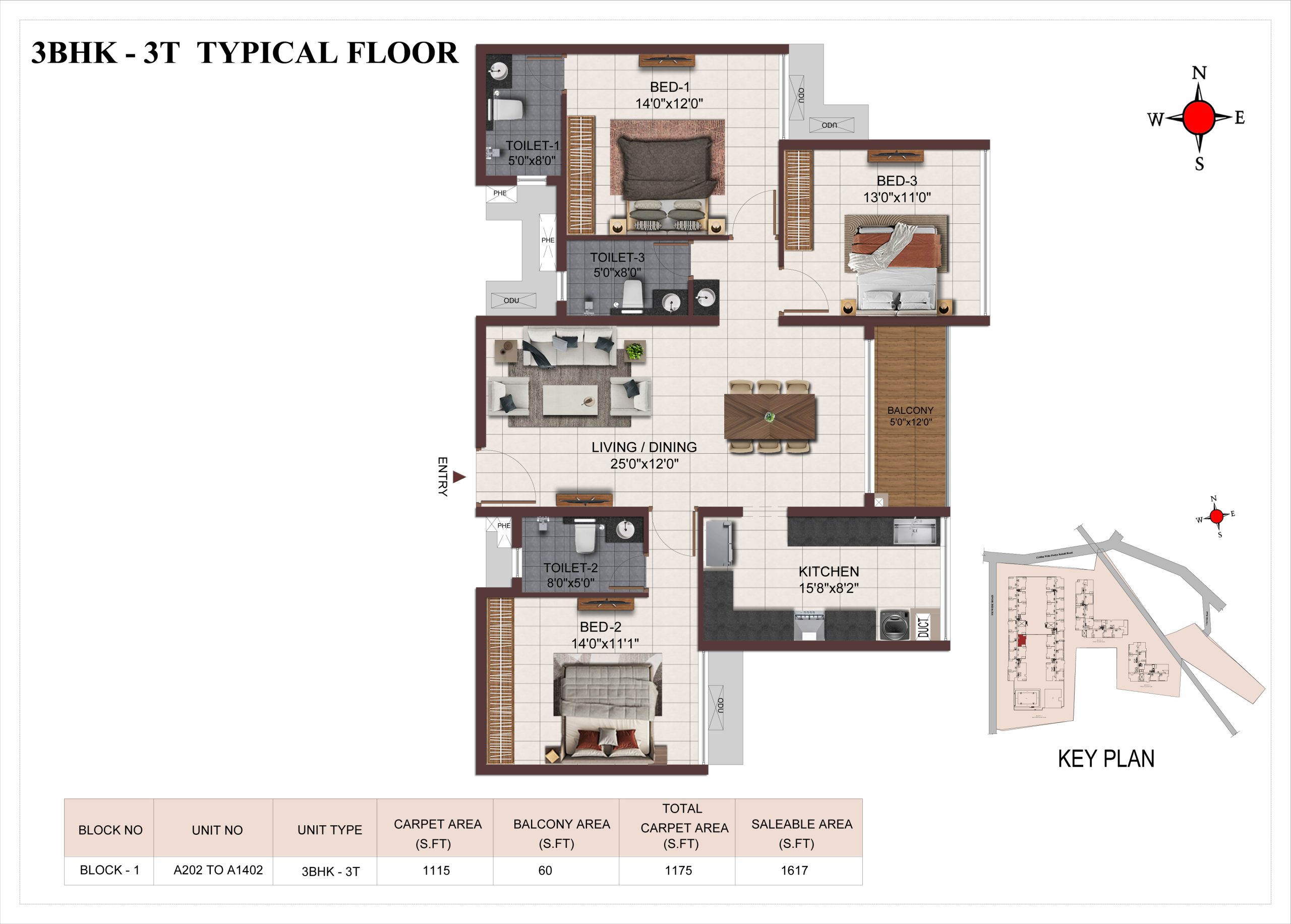 Main flooring (Foyer, Living, Dining, Internal Passage, Kitchen and Bedrooms) : Vitrified tiles of size 1200 × 600mm