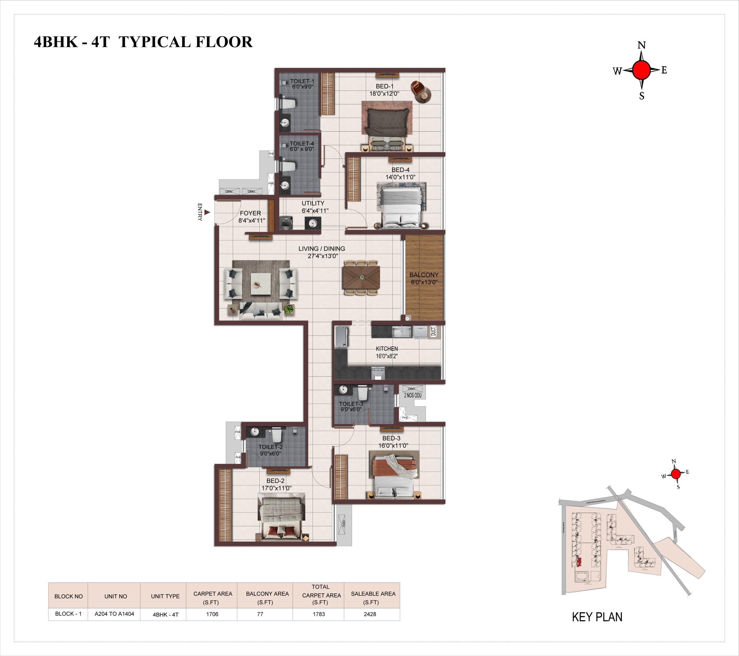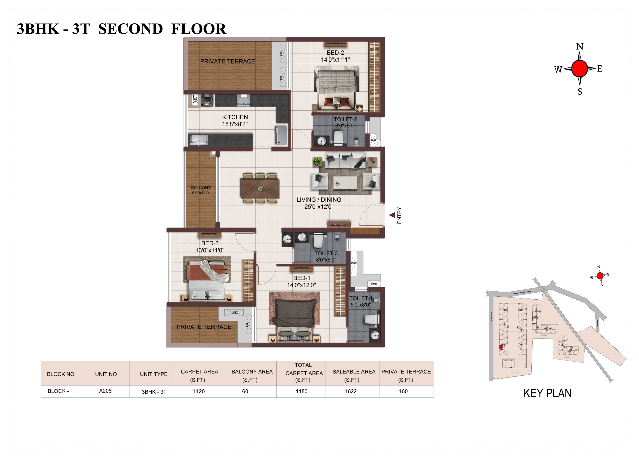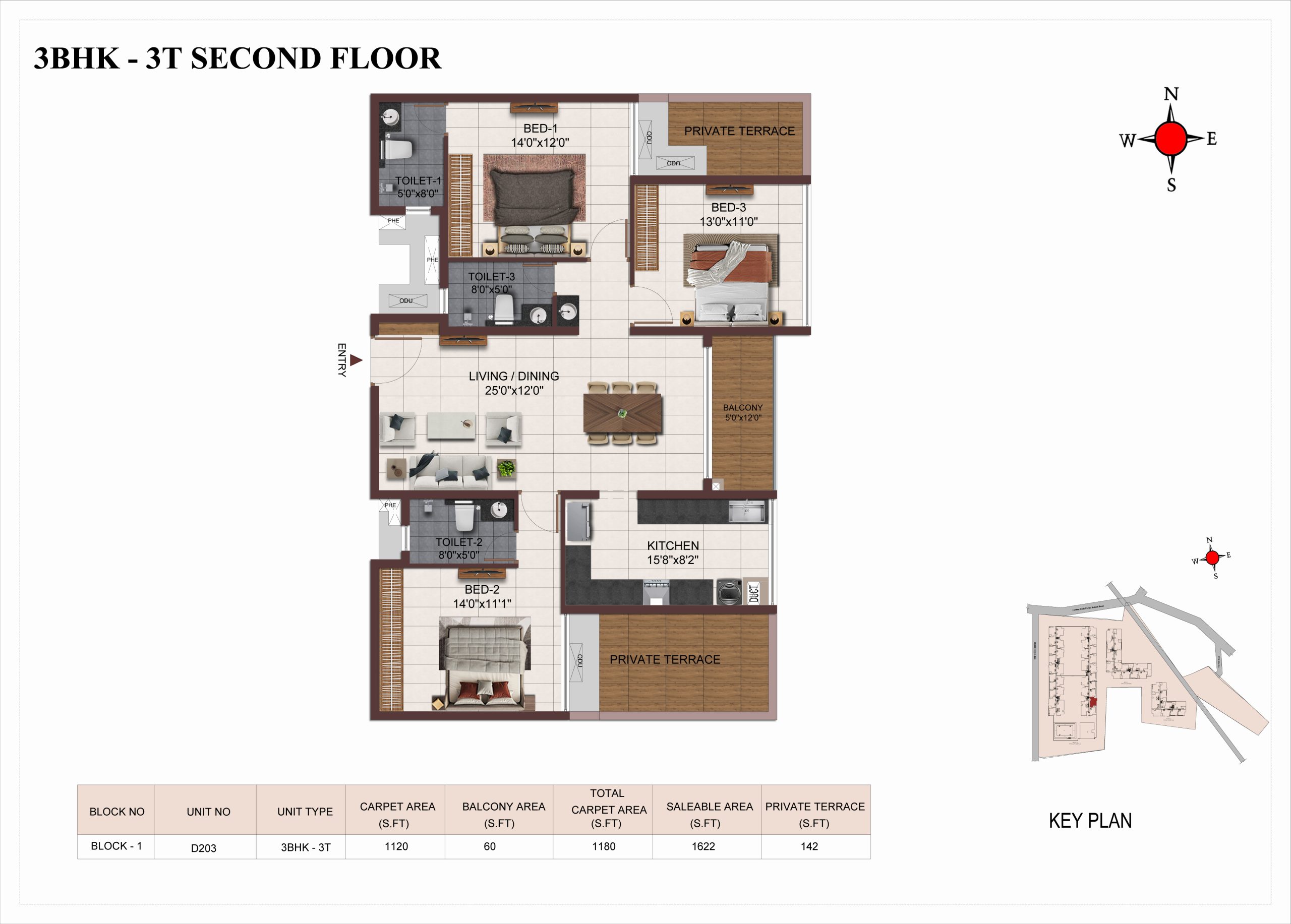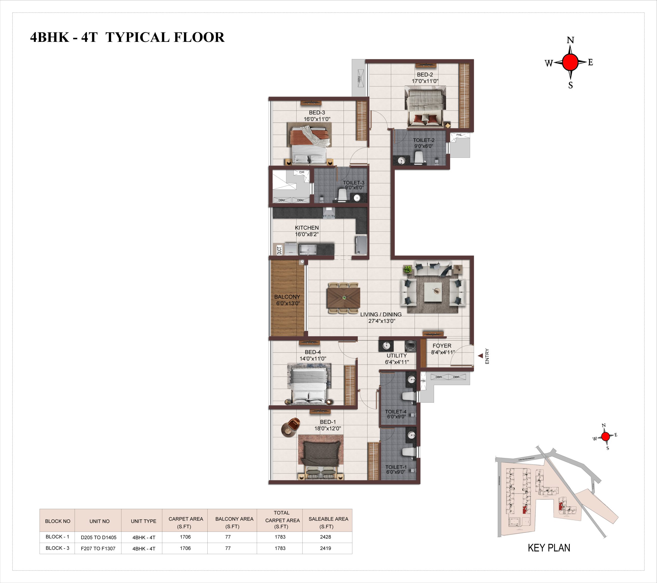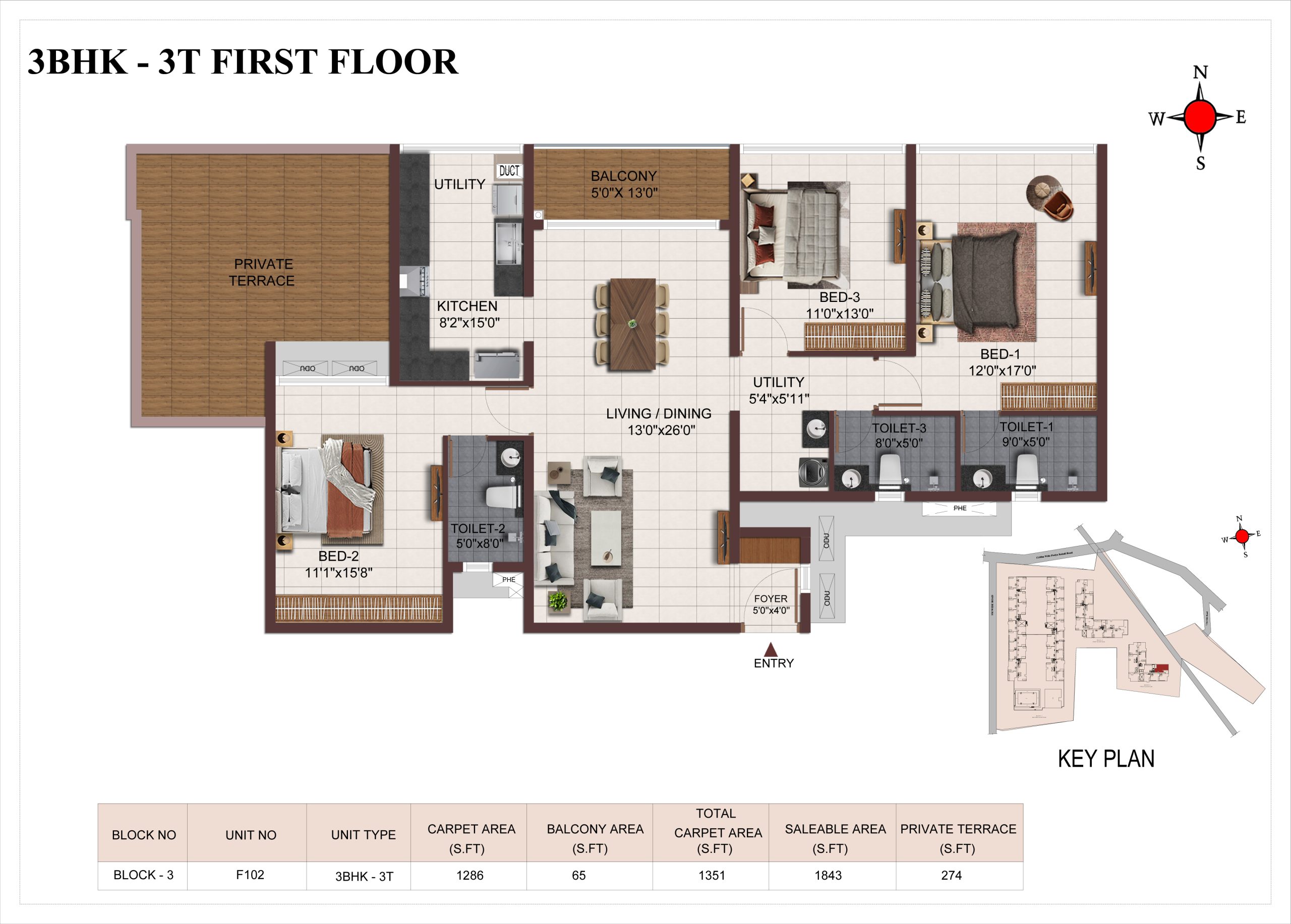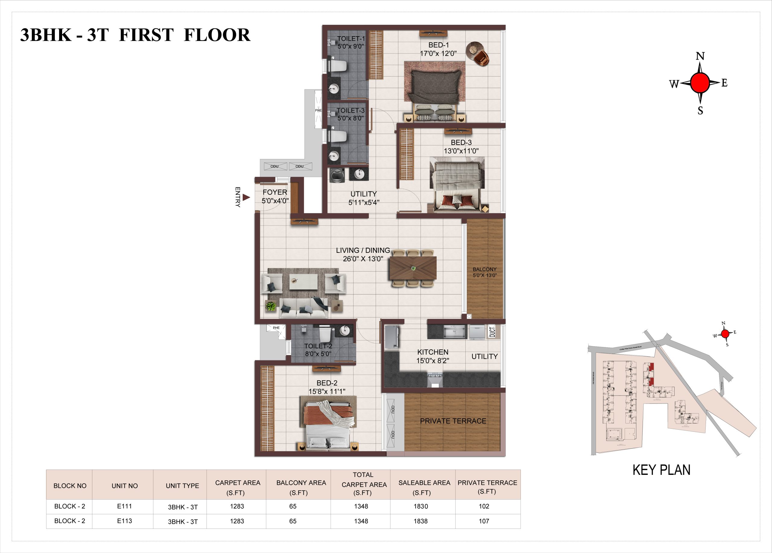 Main flooring (Foyer, Living, Dining, Internal Passage, Kitchen and Bedrooms) : Vitrified tiles of size 1200 × 600mm