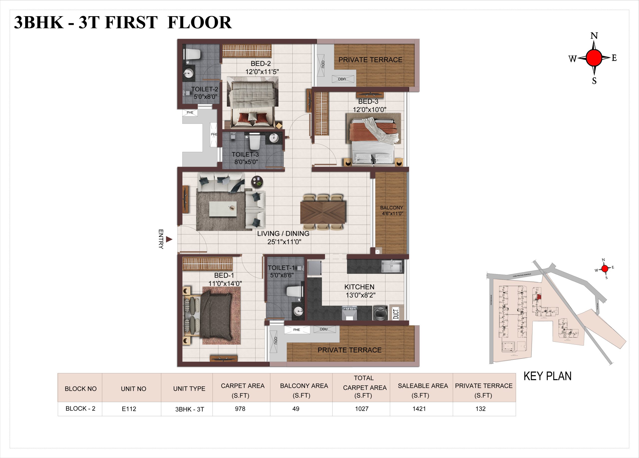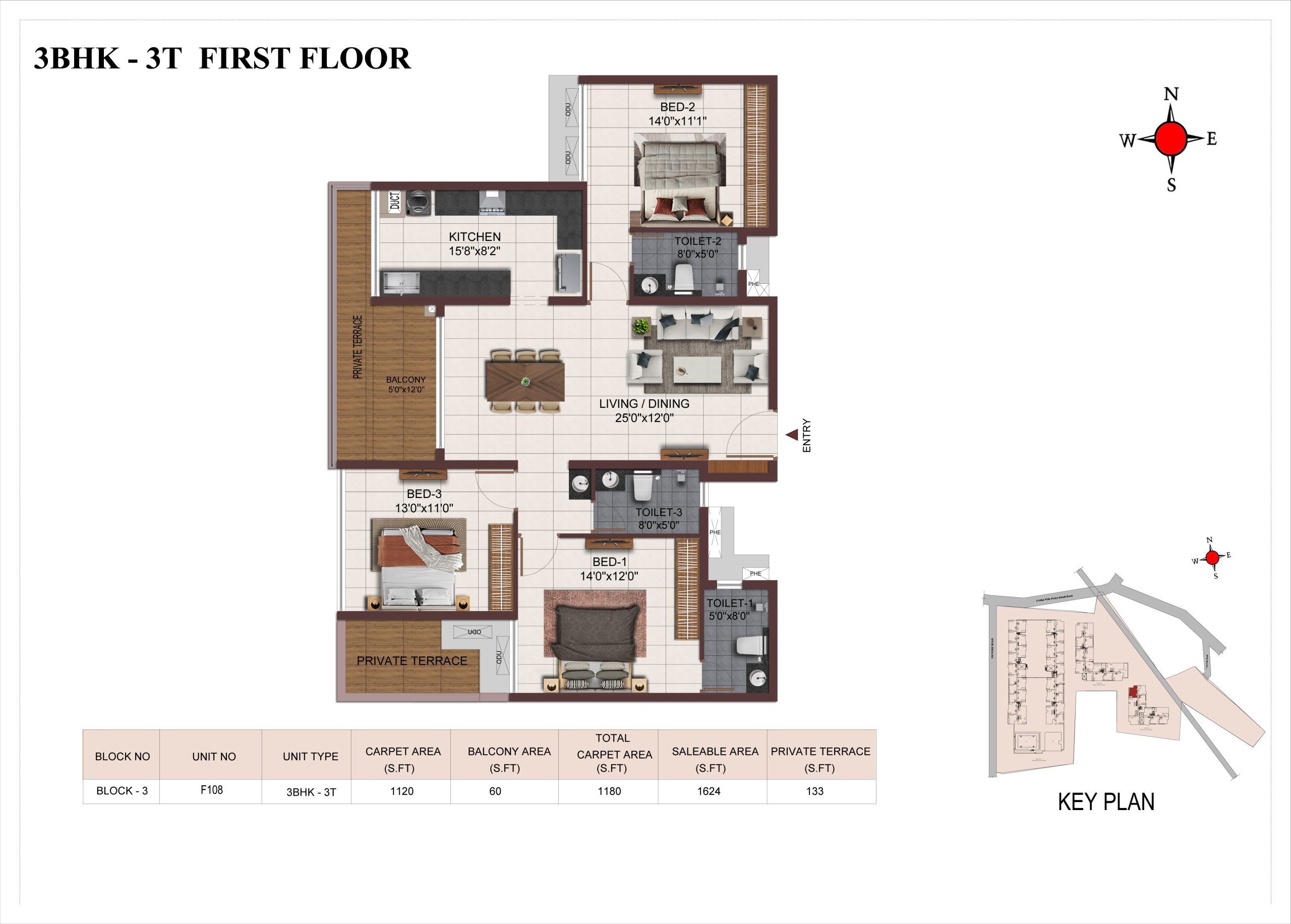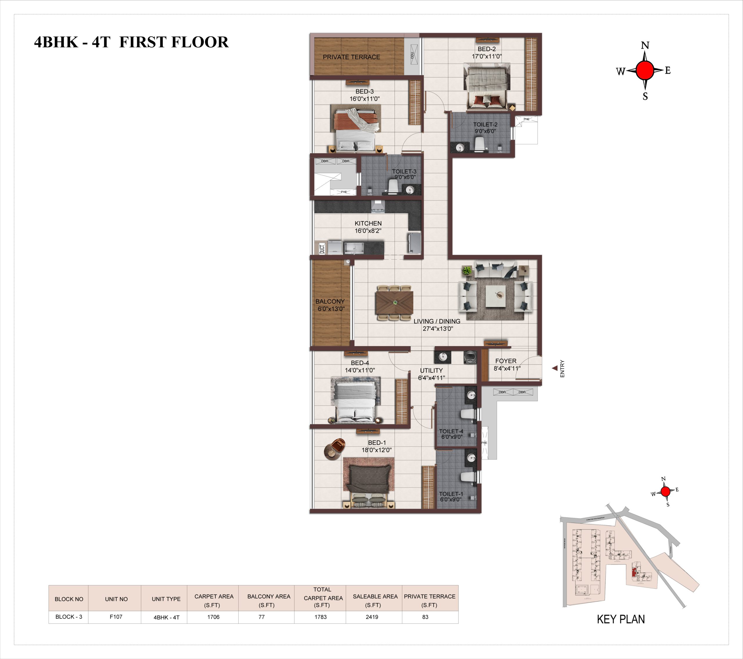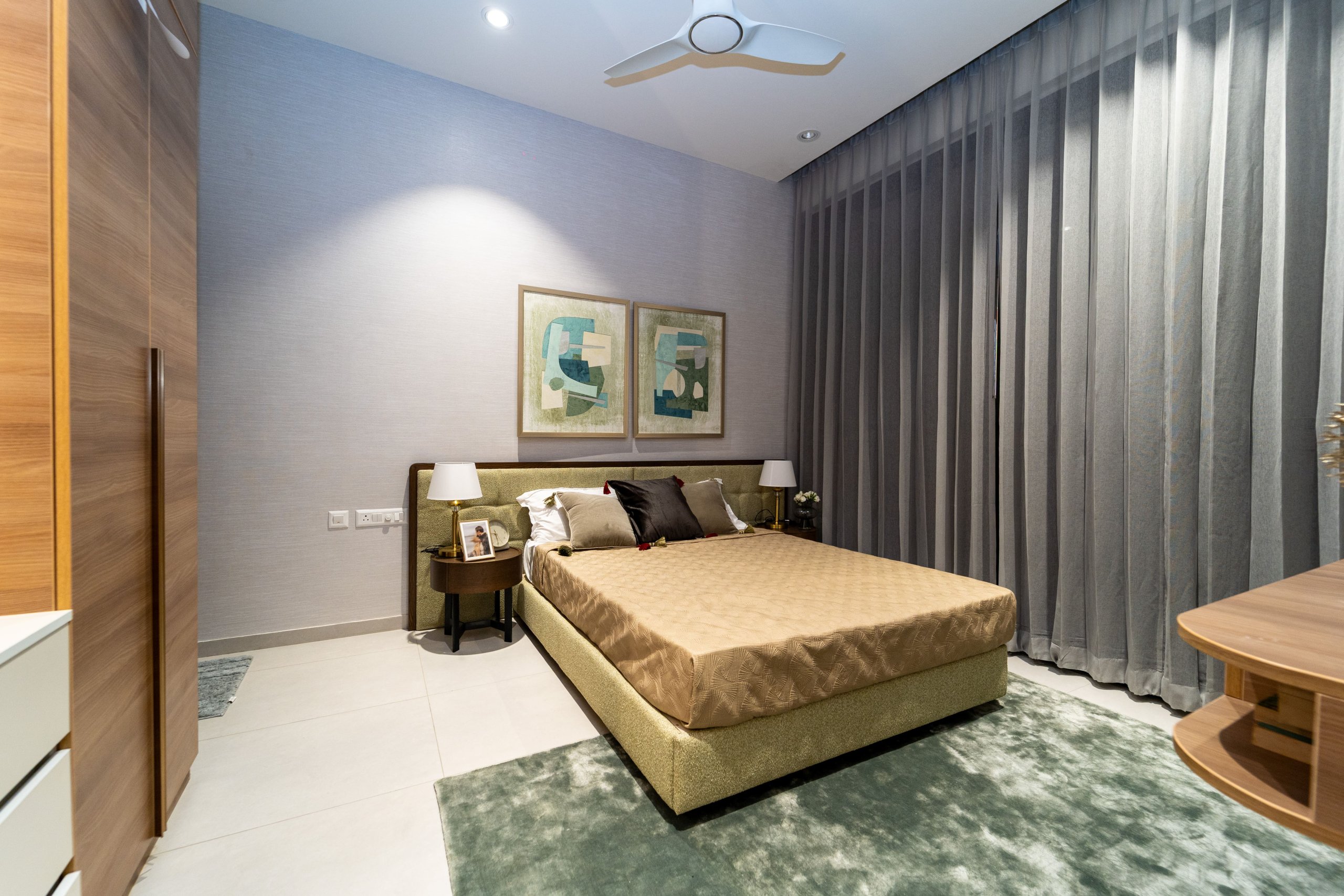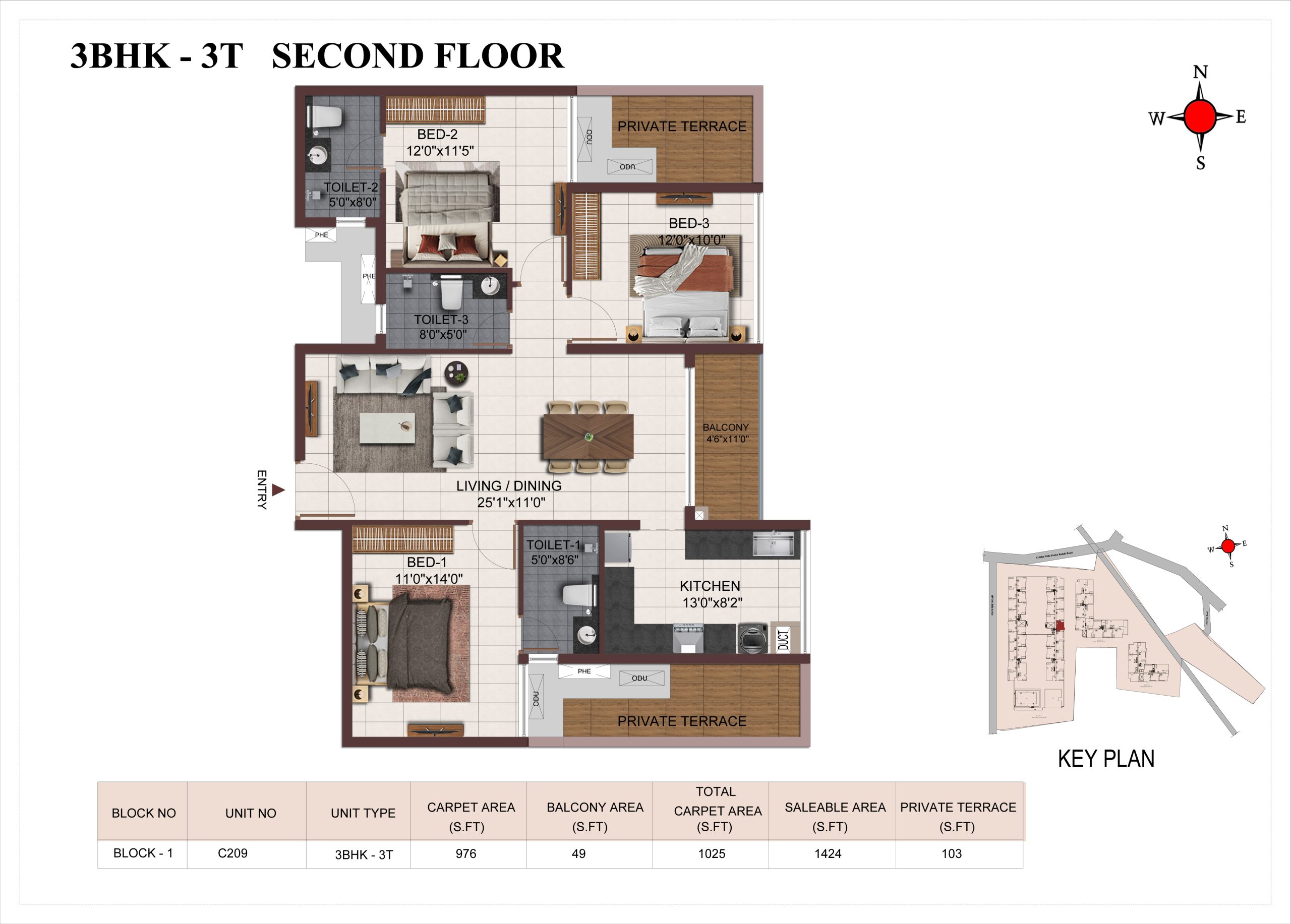 Main flooring (Foyer, Living, Dining, Internal Passage, Kitchen and Bedrooms) : Vitrified tiles of size 1200 × 600mm