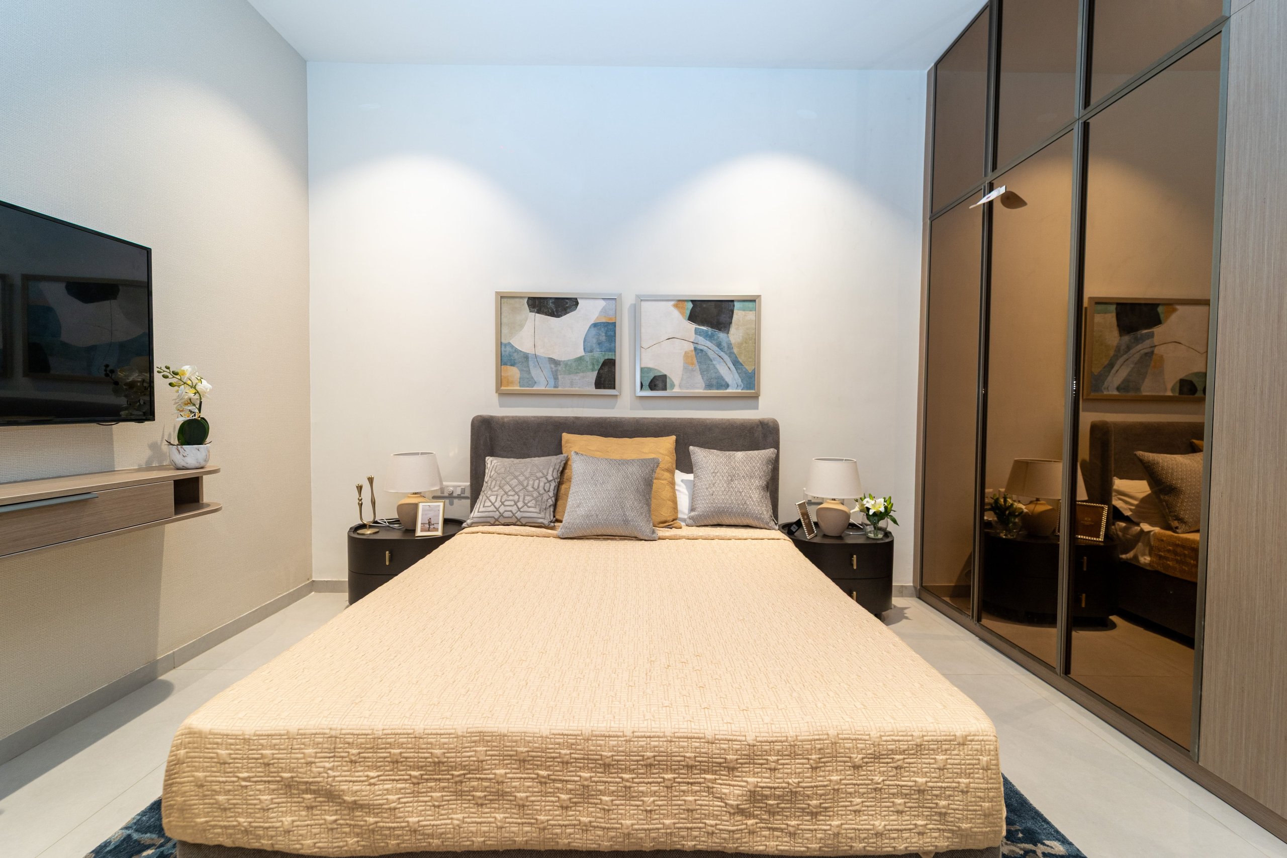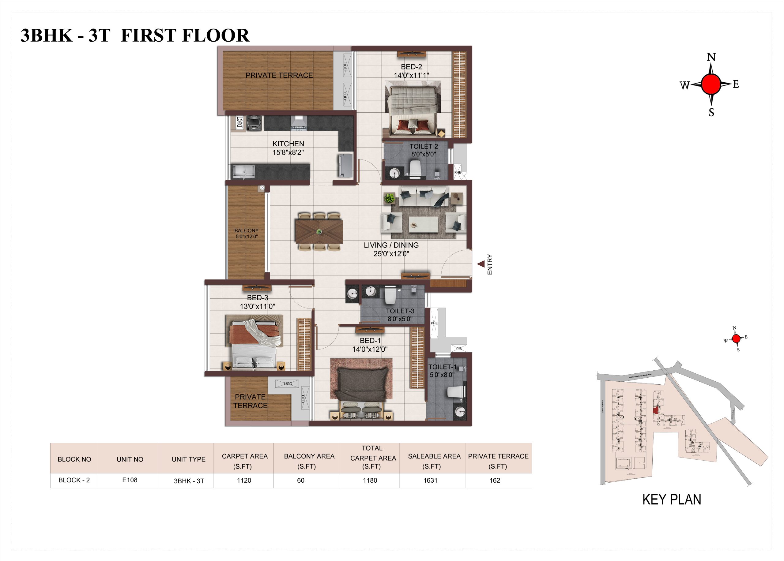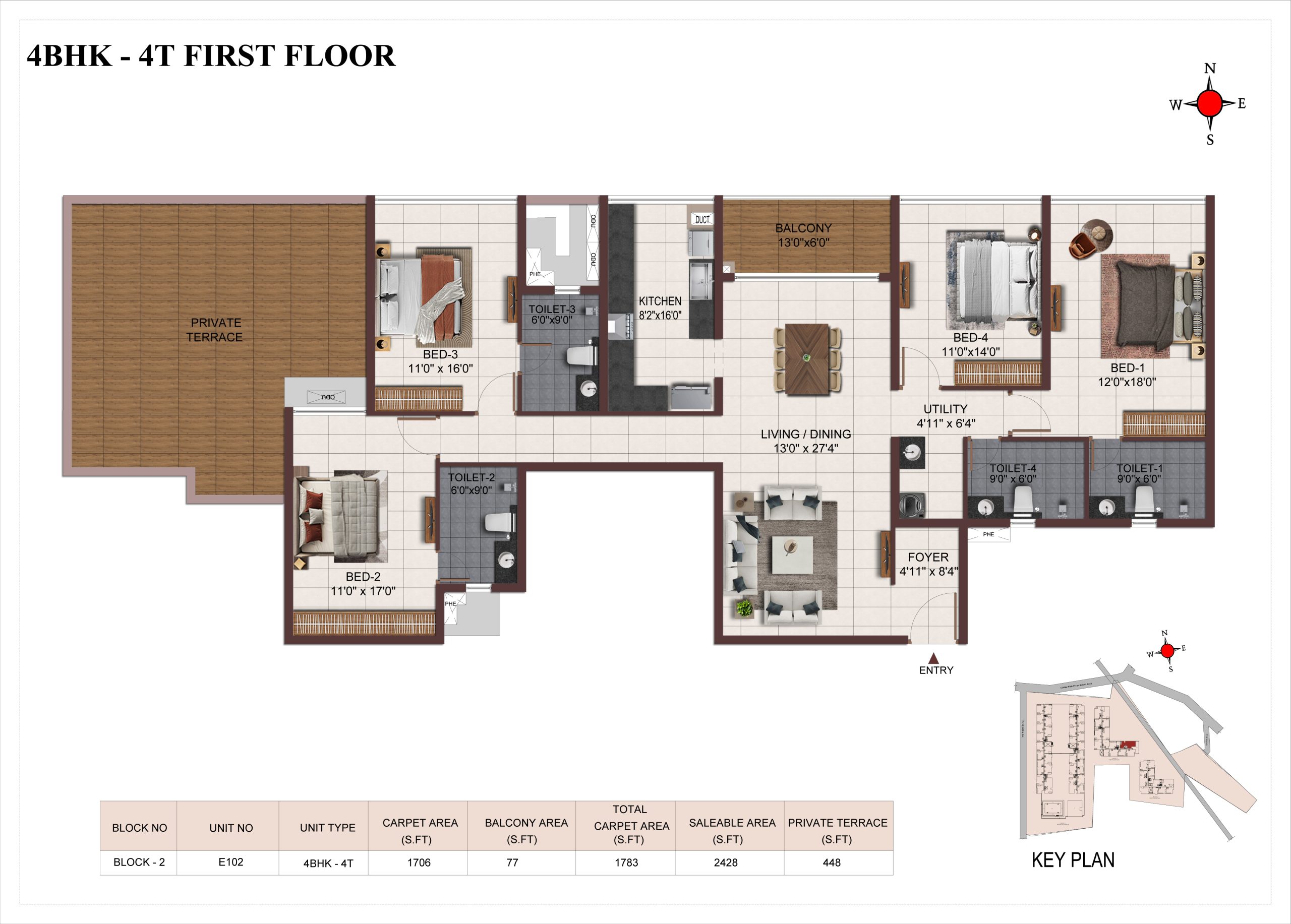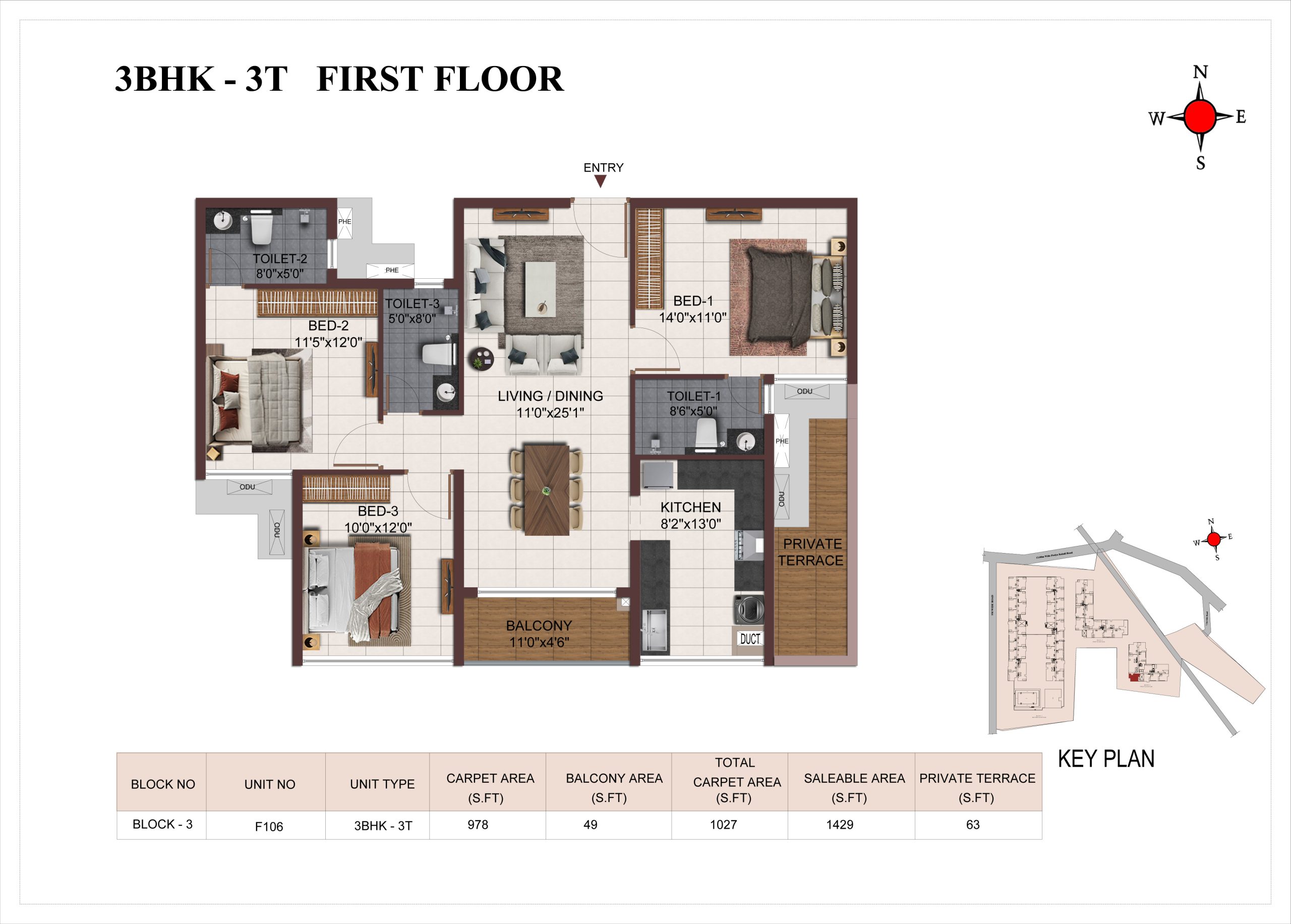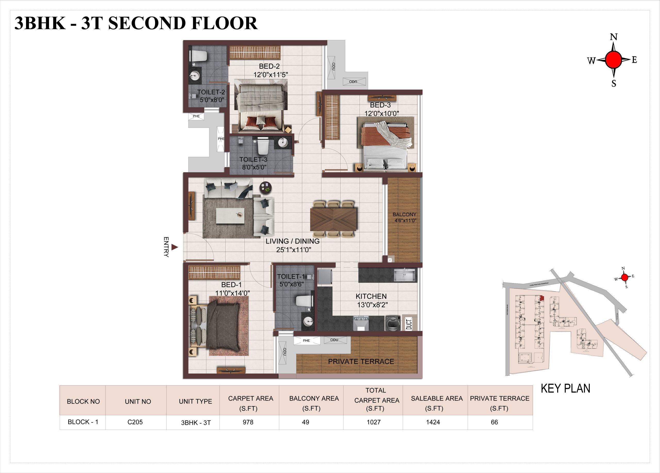 Main flooring (Foyer, Living, Dining, Internal Passage, Kitchen and Bedrooms) : Vitrified tiles of size 1200 × 600mm