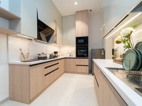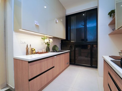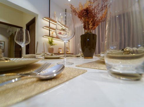 Dining : Granite countertops wash basin and wall dado tile of height 300mm (wherever applicable)