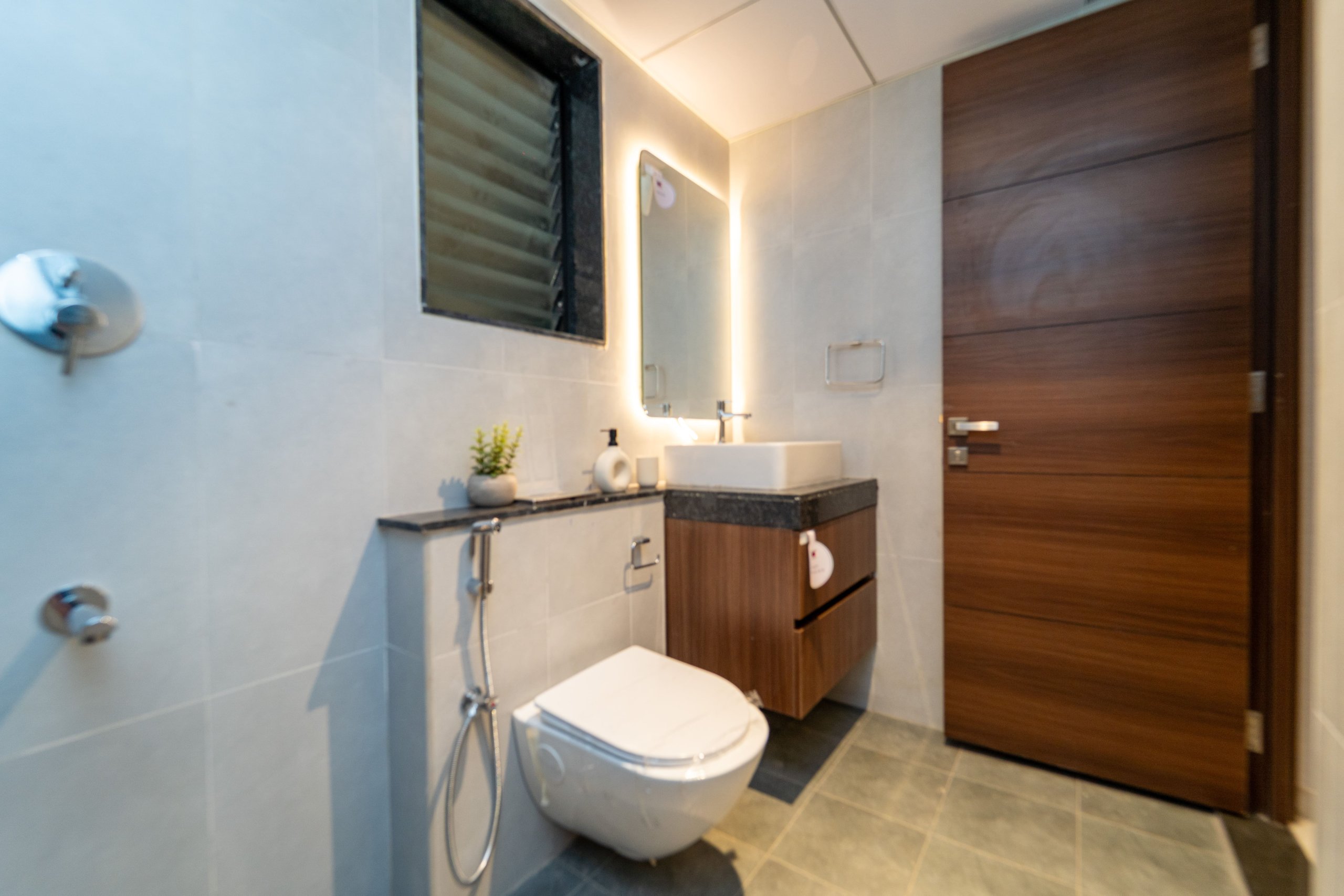 Bathroom : Matt / Glossy ceramic wall tile of size 600×300mm for height of 2350mm & will be finished with a coat of primer above false ceiling