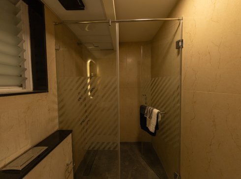 Rain shower, hand shower, foldable seater and spout with glass partition with openable door and granite counter mounted wash basin and 2’ long trench drain