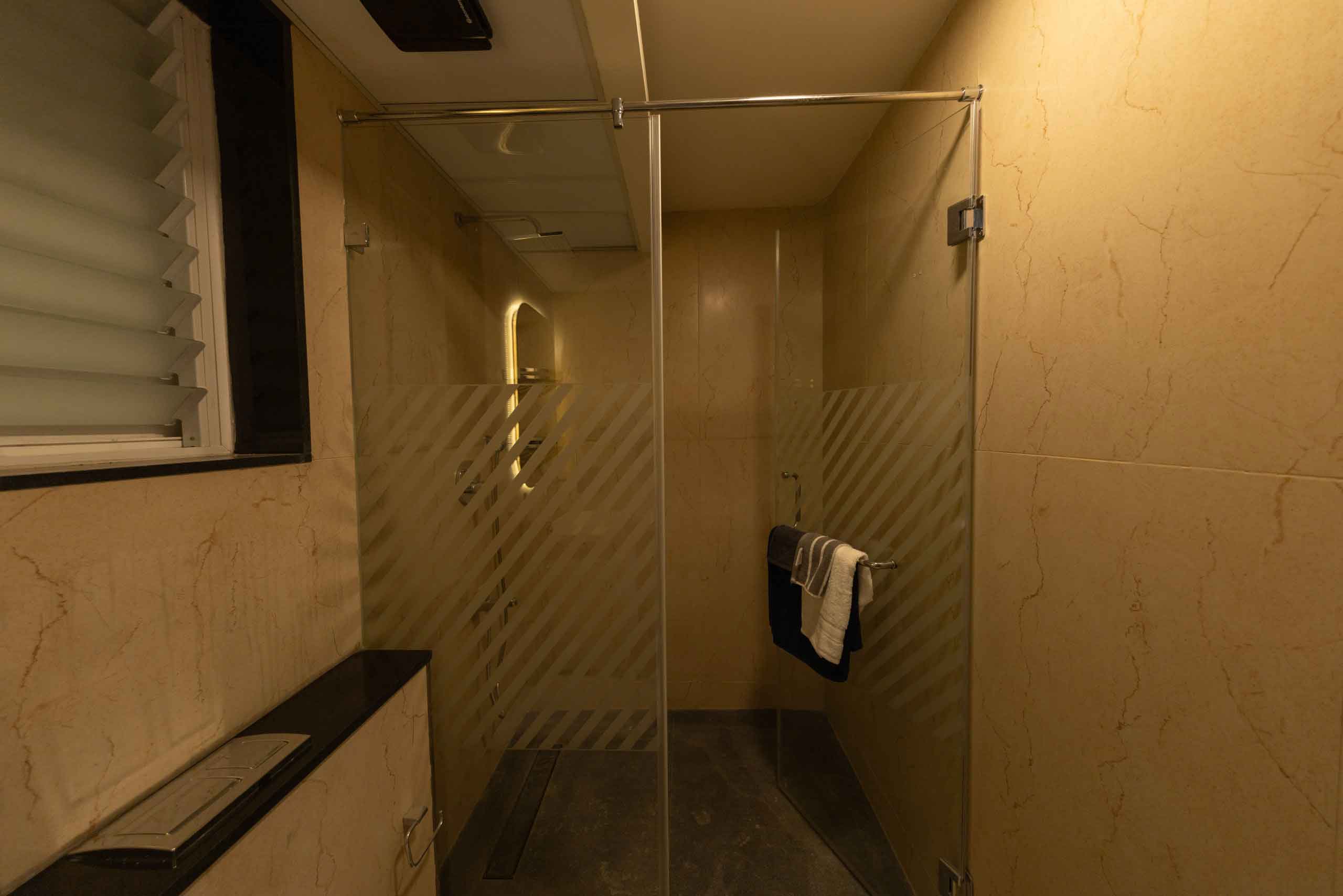 Master Bathroom : Anti-skid ceramic tile of size 600x600mm with granite in shower area