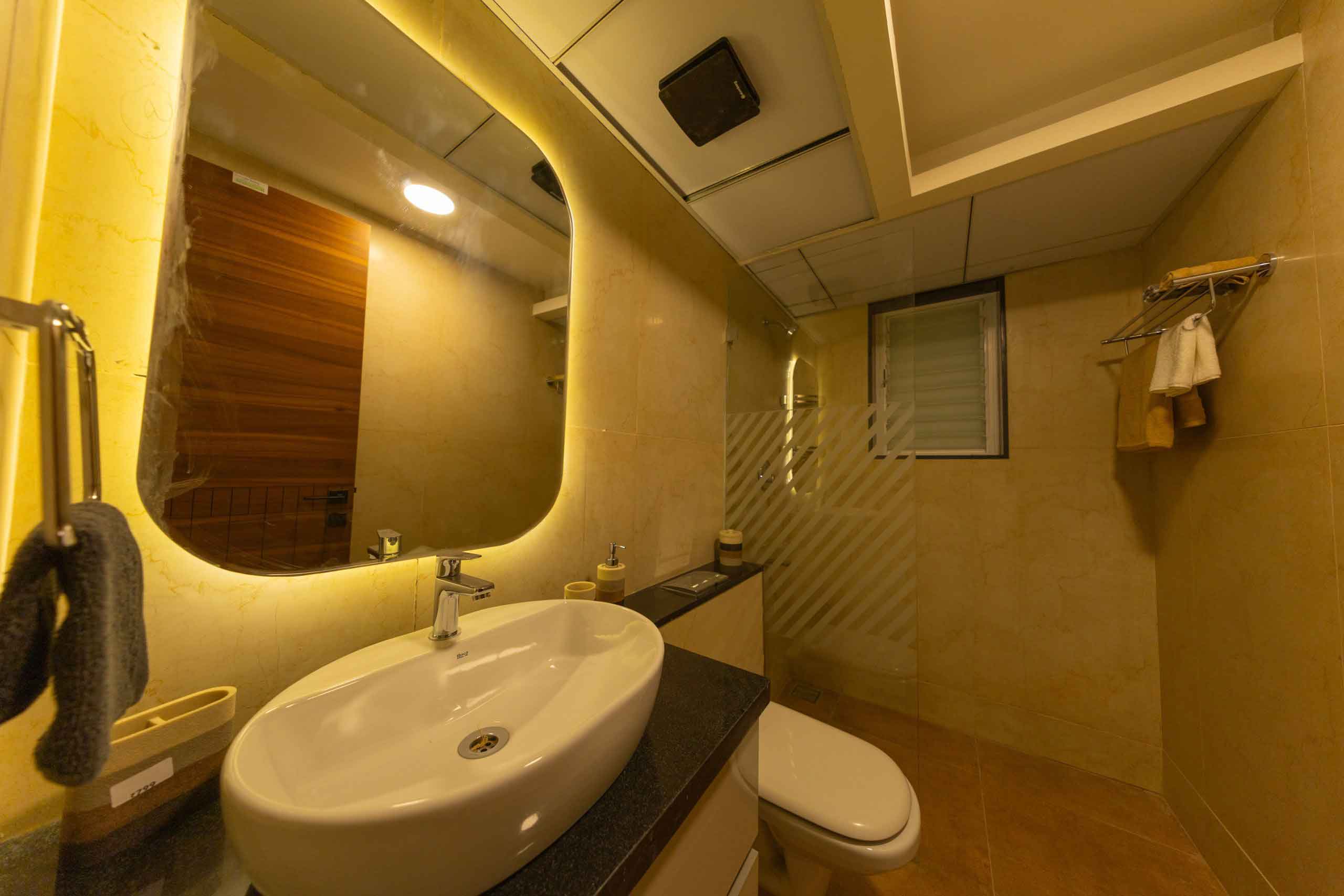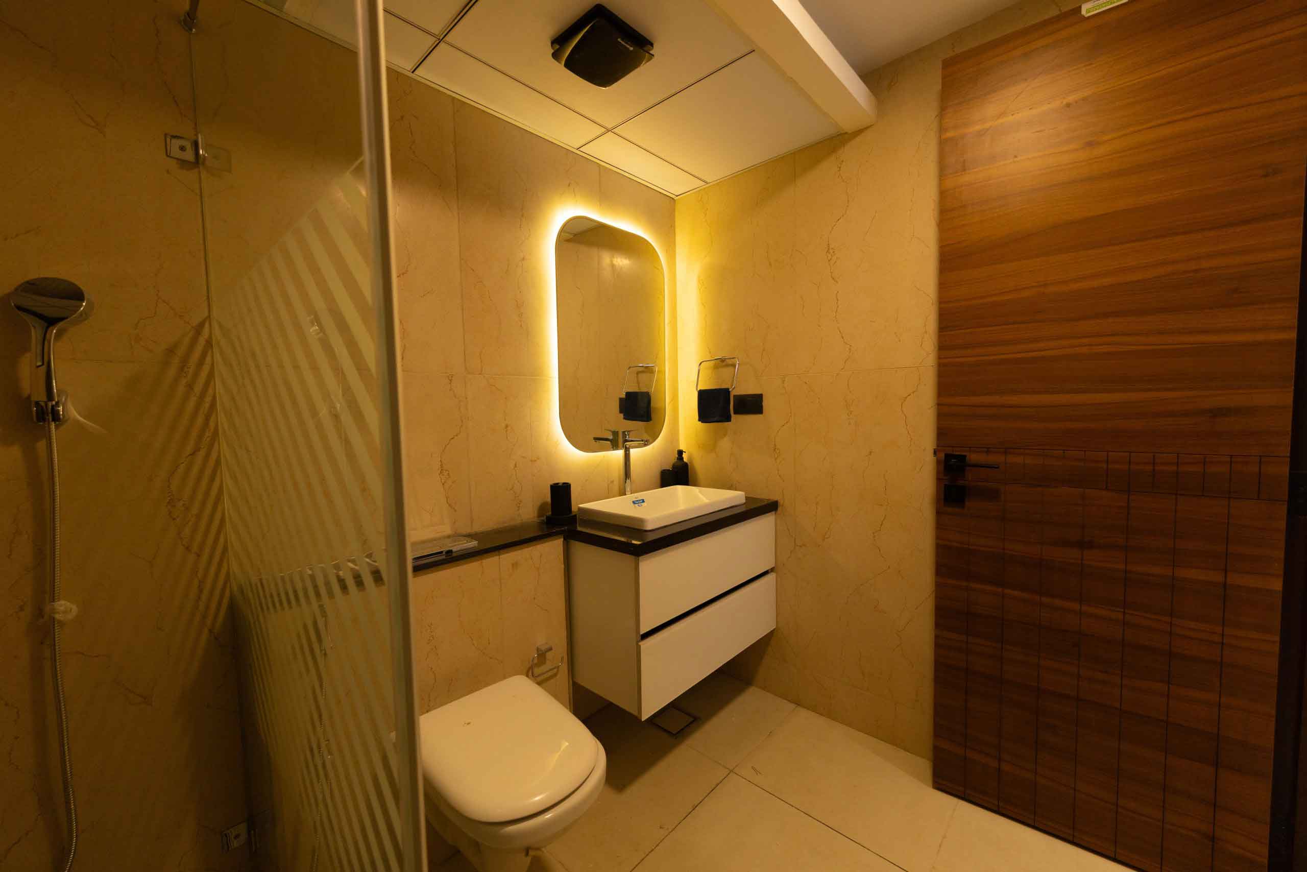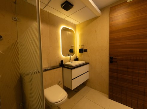 Bathroom doors : Good quality teak wood frame with double-sided laminated designer door of size 800x2300mm and granite architrave with designer door handle