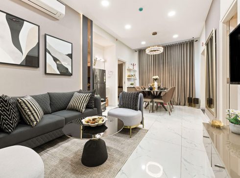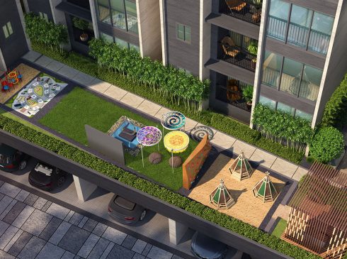 14. Enjoy the Serenity of the flowing spaces around the apartment towers with Viewing decks, an Organic garden, an Herbal boulevard, a seating plaza, and a party lawn.