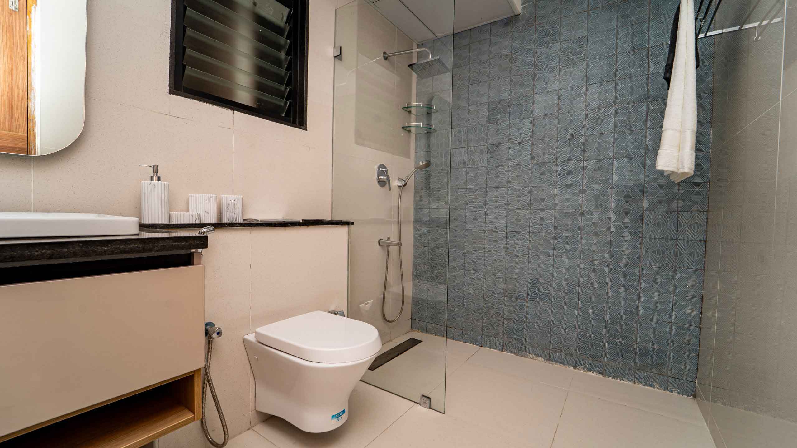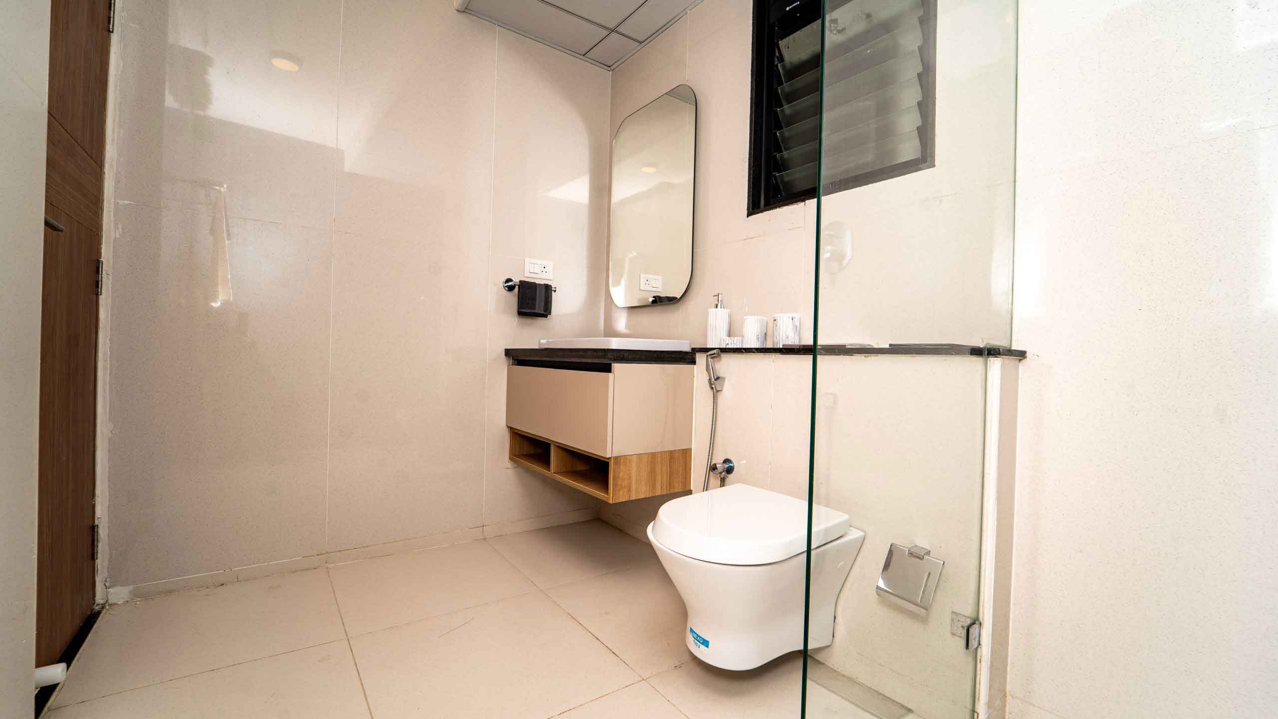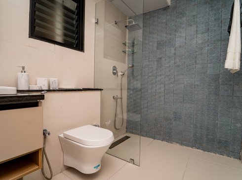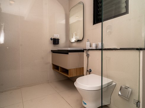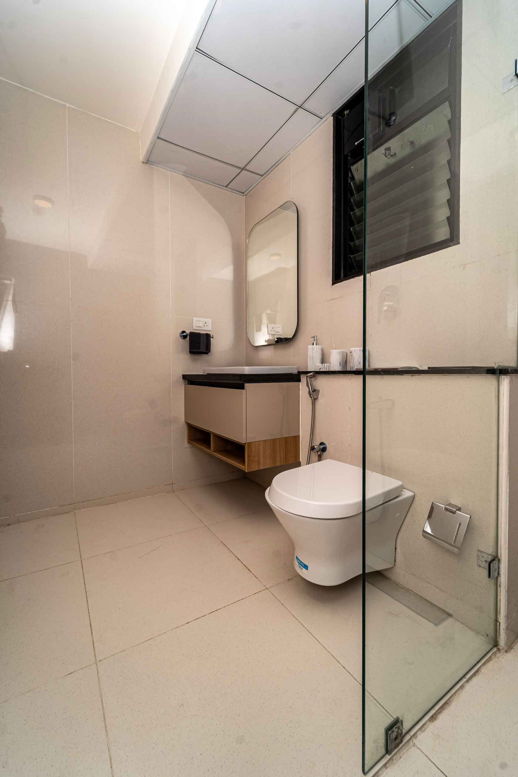Bathroom : Matt / Glossy ceramic wall tile of size 600x1200mm and 300x300mm for height of 2450mm & will be finished with