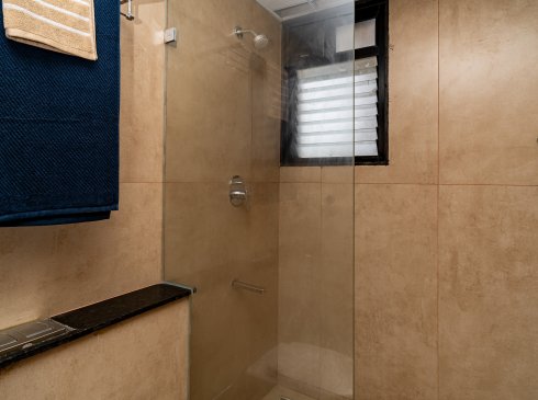 counter mounted washbasin, glass partition for shower and 2’ long tile flushed shower drain channel