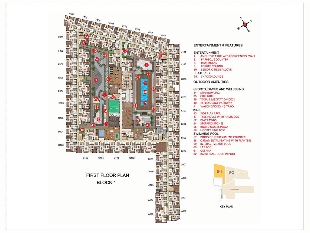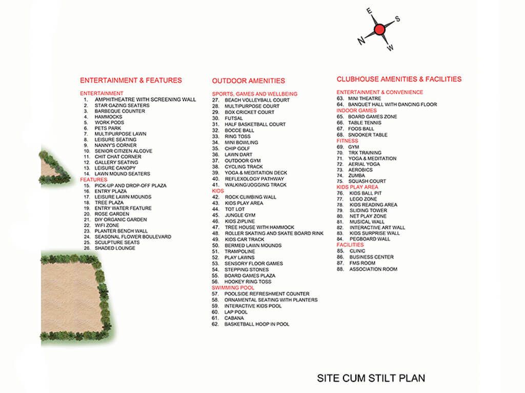 facilities like multipurpose hall, Indoor games room, Gym, Kids play area, Mini
