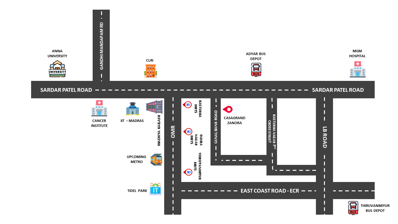 Nestled in the prestigious locale of Kasturba Nagar, Adyar. Zanora offers just 15 exclusive 3BHK apartments — a rare opportunity to own a piece of luxury in one of Chennai’s most sought-after neighborhoods. Each meticulously designed home epitomises modern sophistication and comfort,