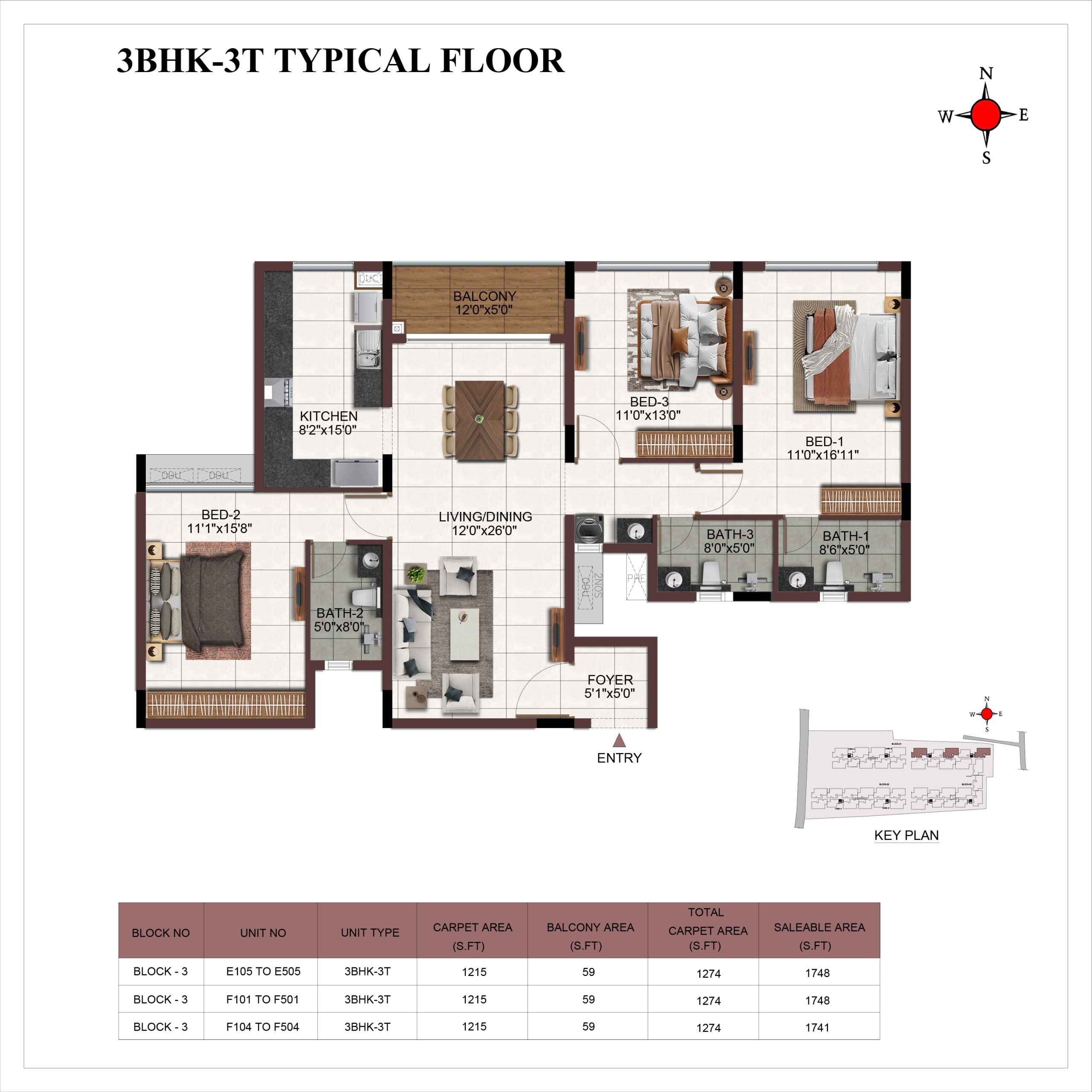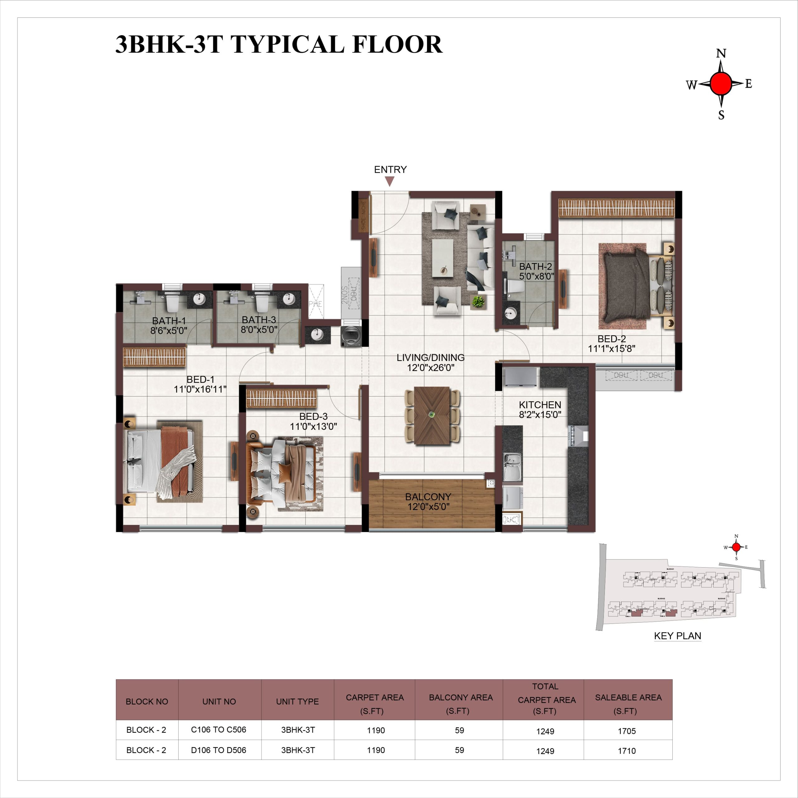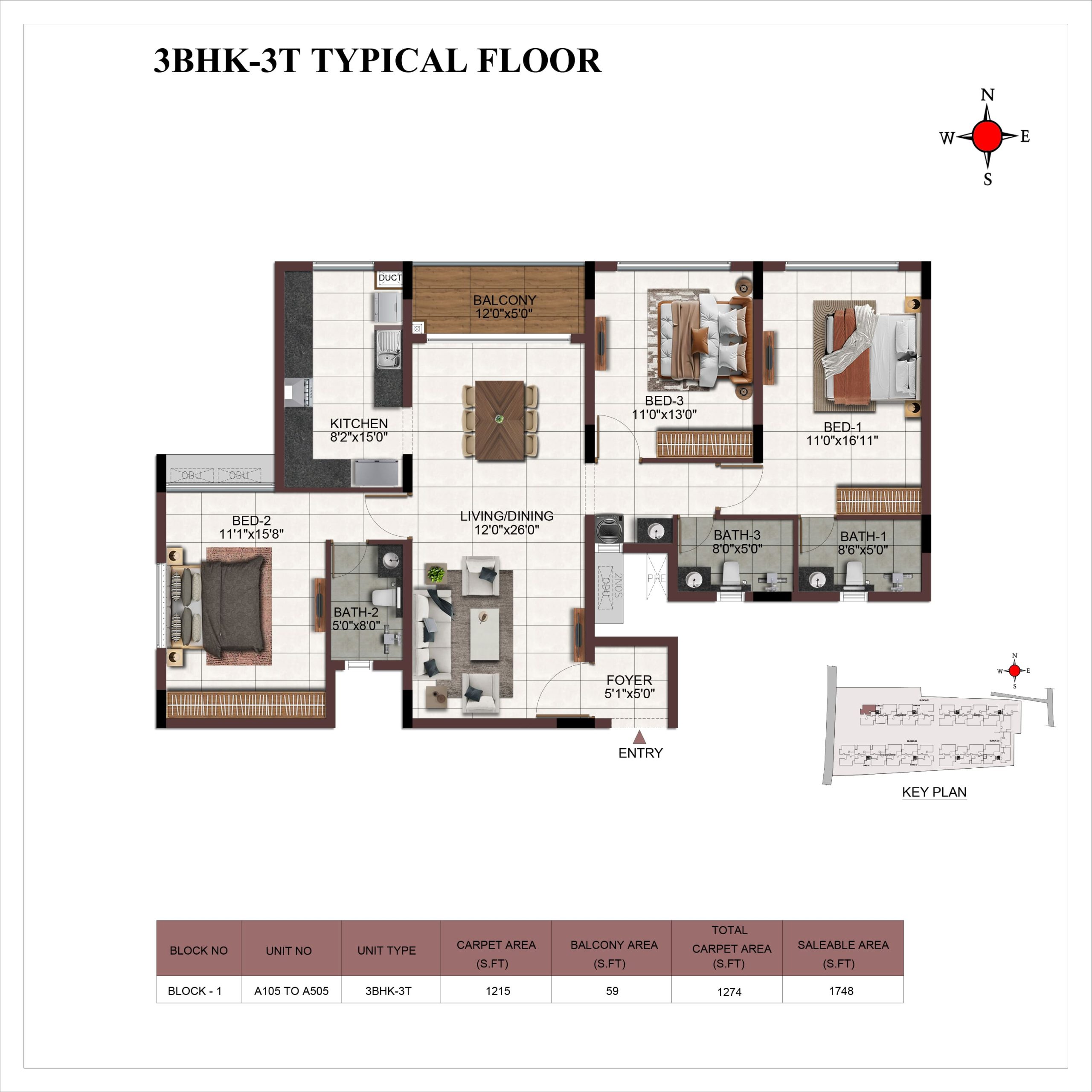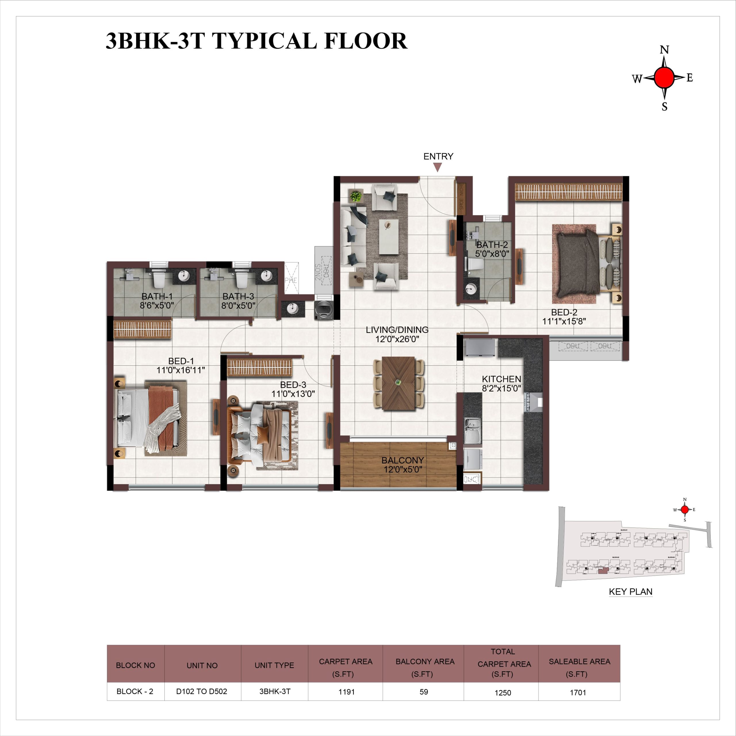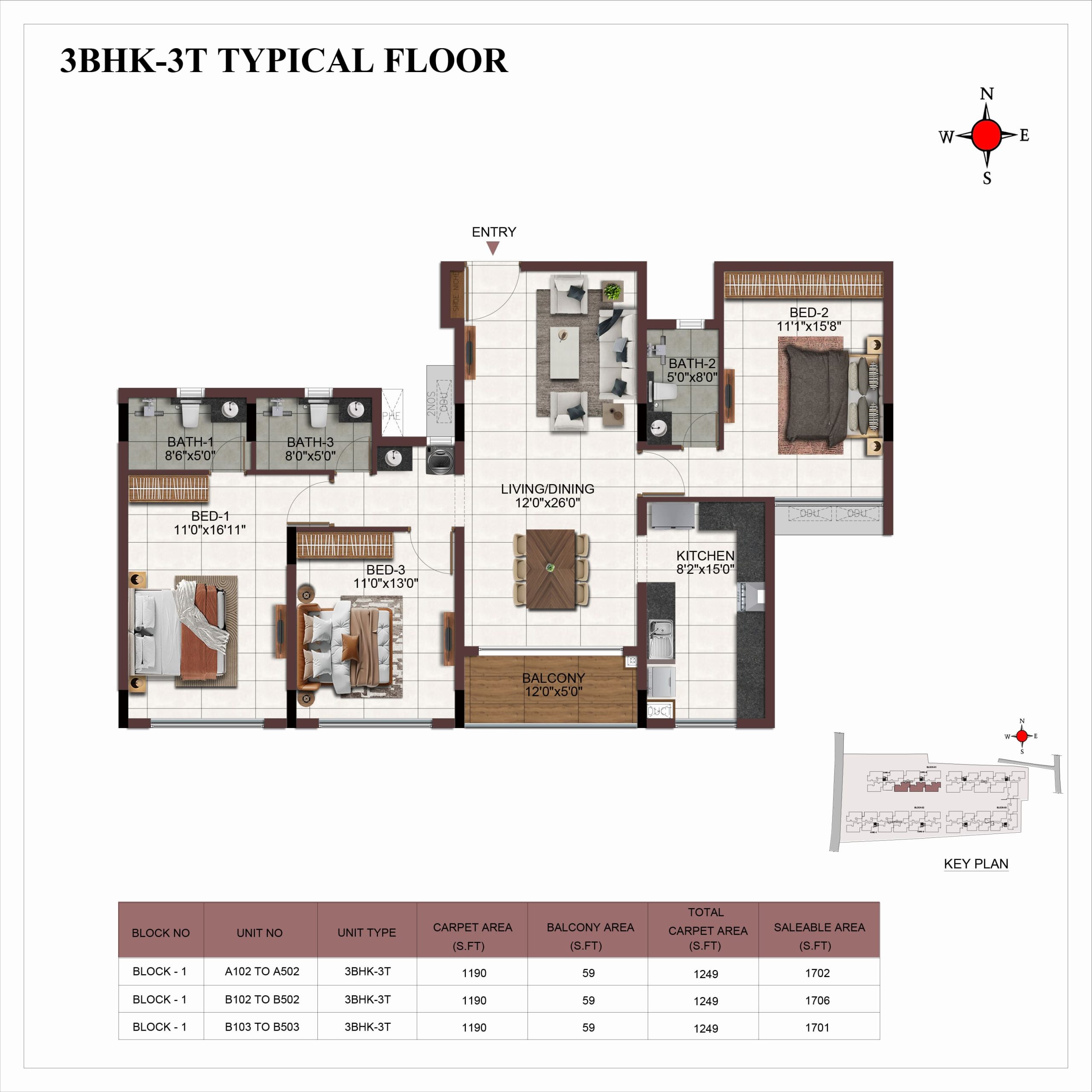| 3 BHK | Apartment | 1748 Sqft - 2010 Sqft | ₹ 5799/Sqft | ₹ 1.09Cr to 1.23Cr |