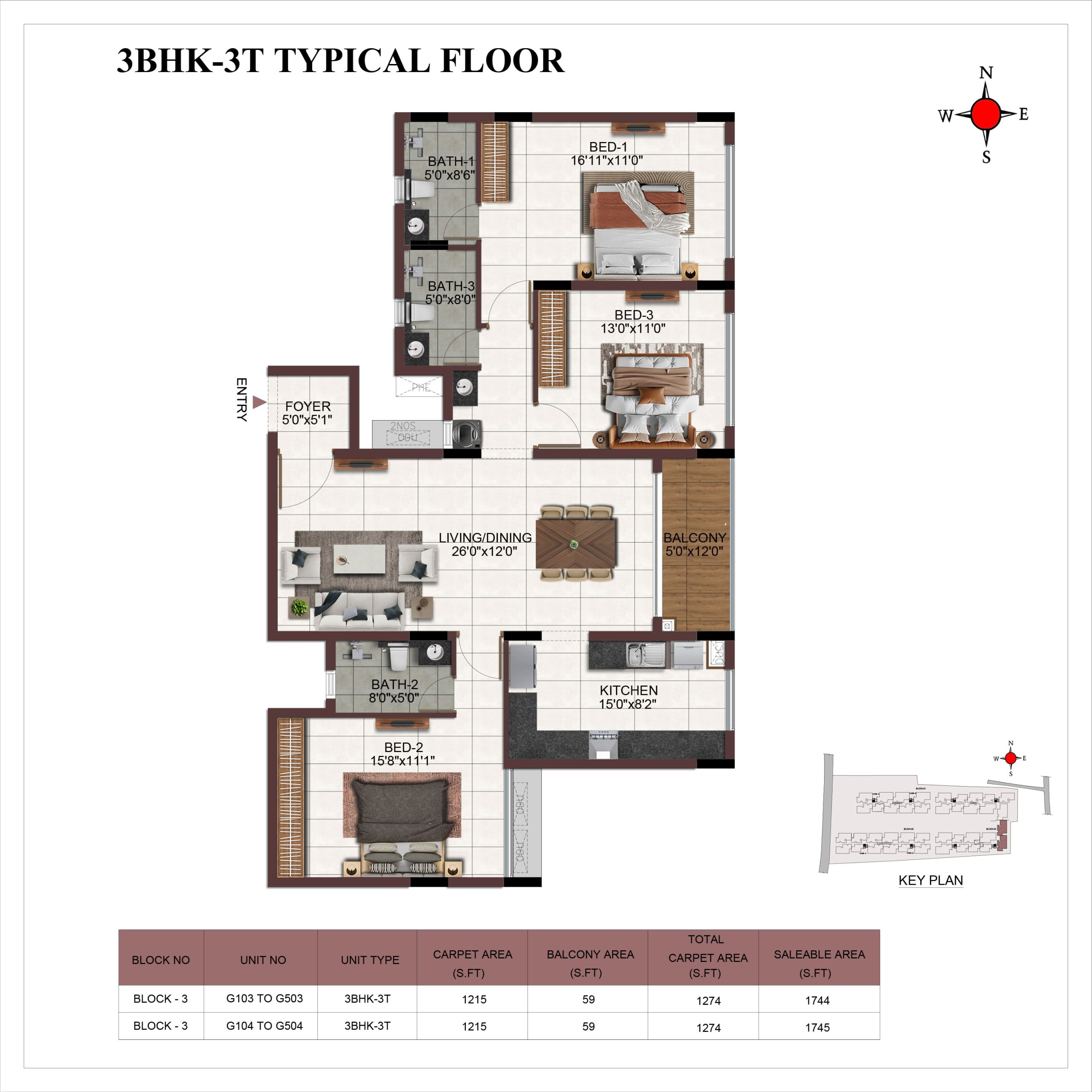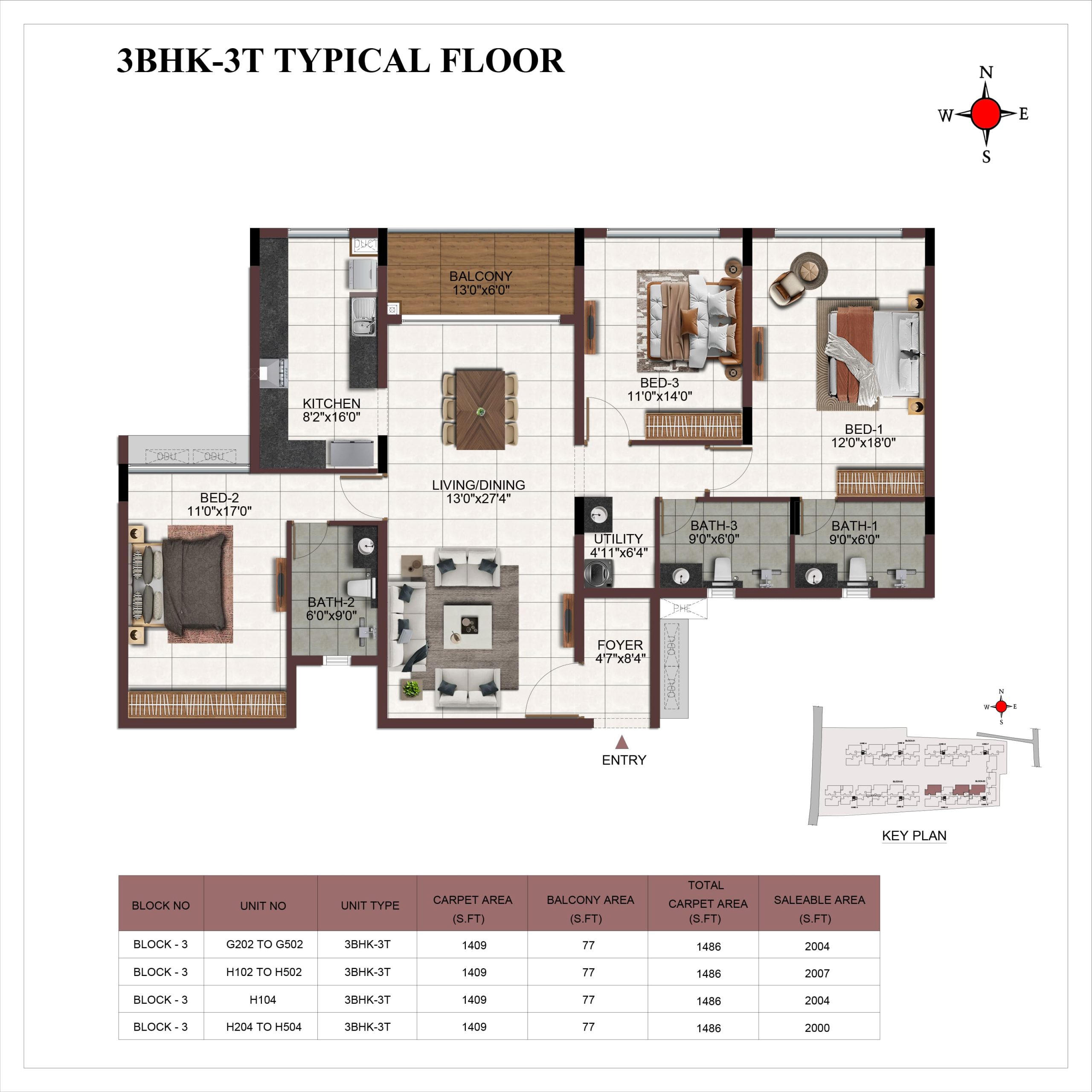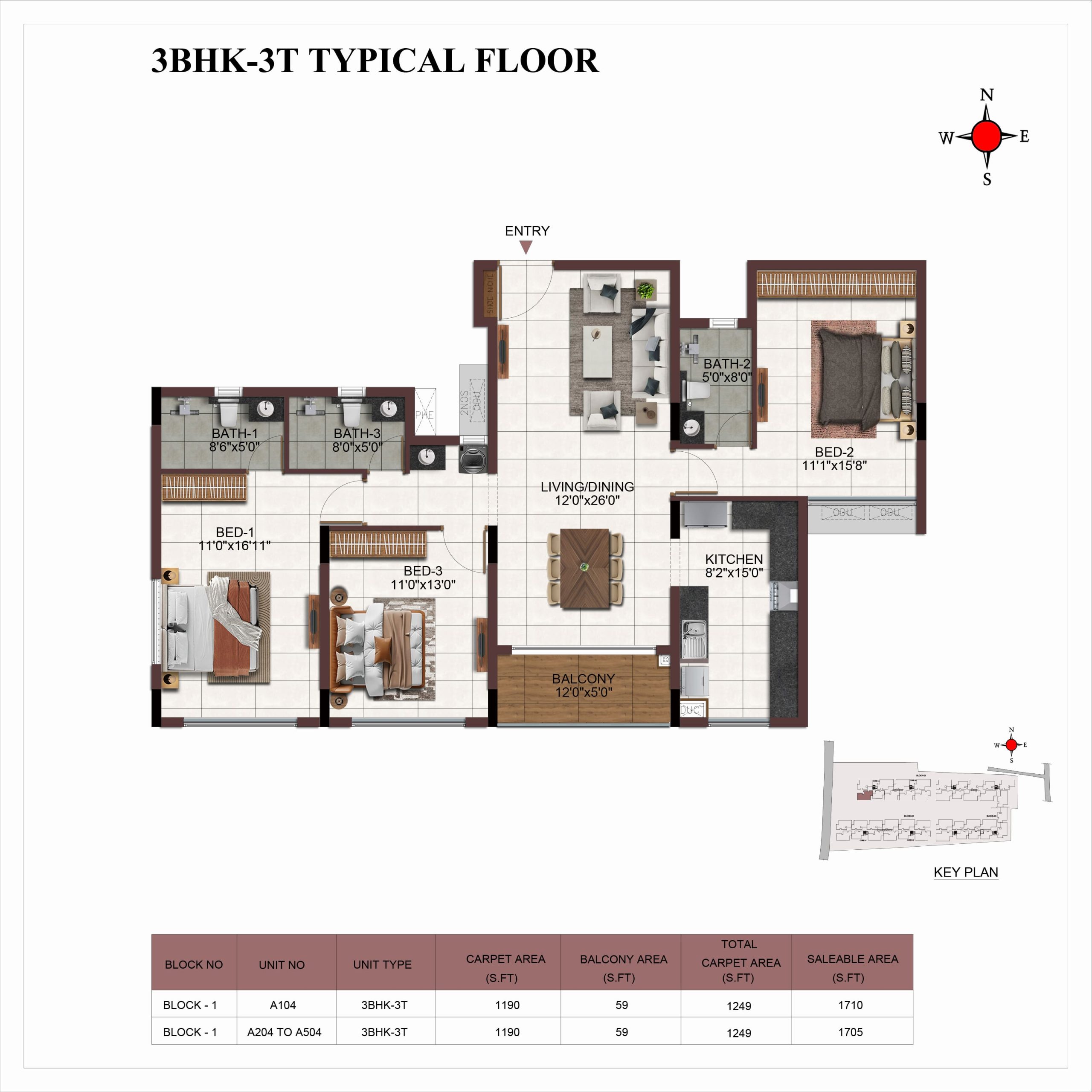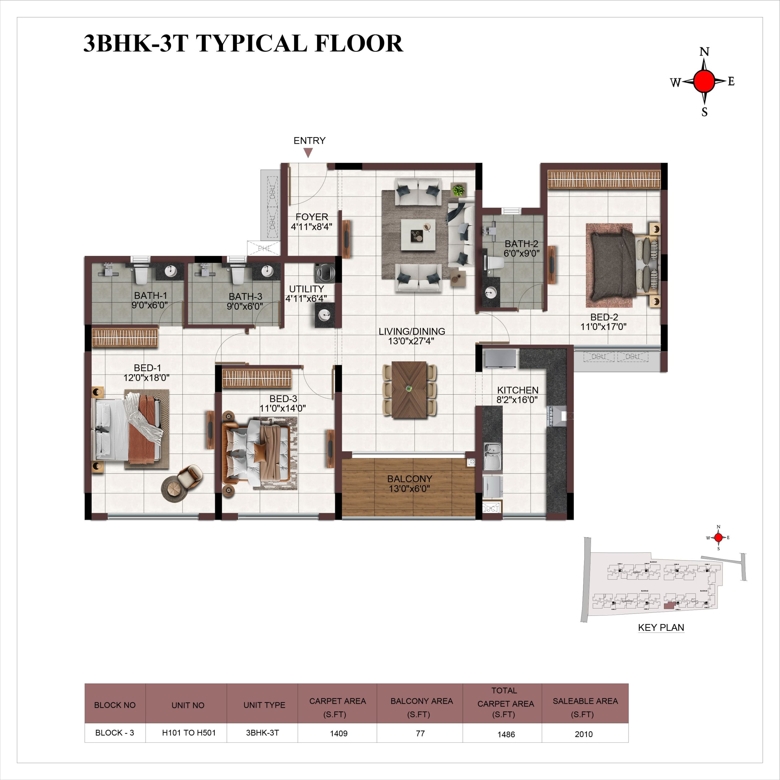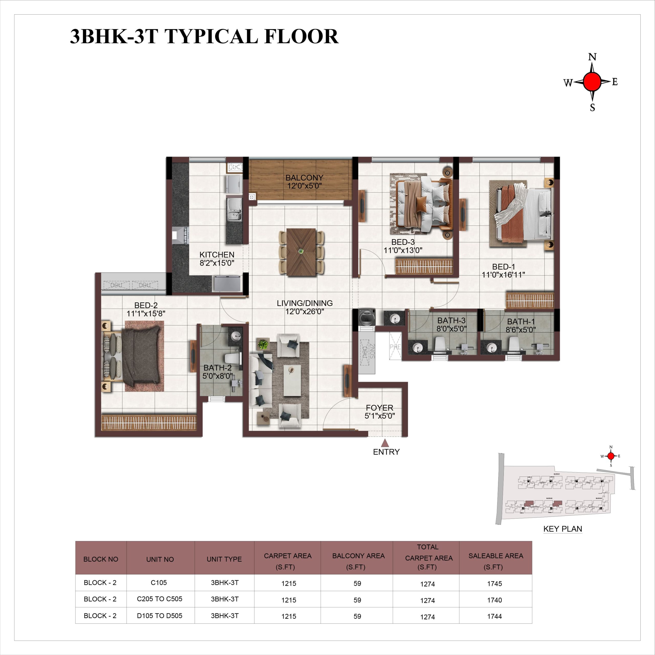 | 3 BHK | Apartment | 1748 Sqft - 2010 Sqft | ₹ 5799/Sqft | ₹ 1.09Cr to 1.23Cr |