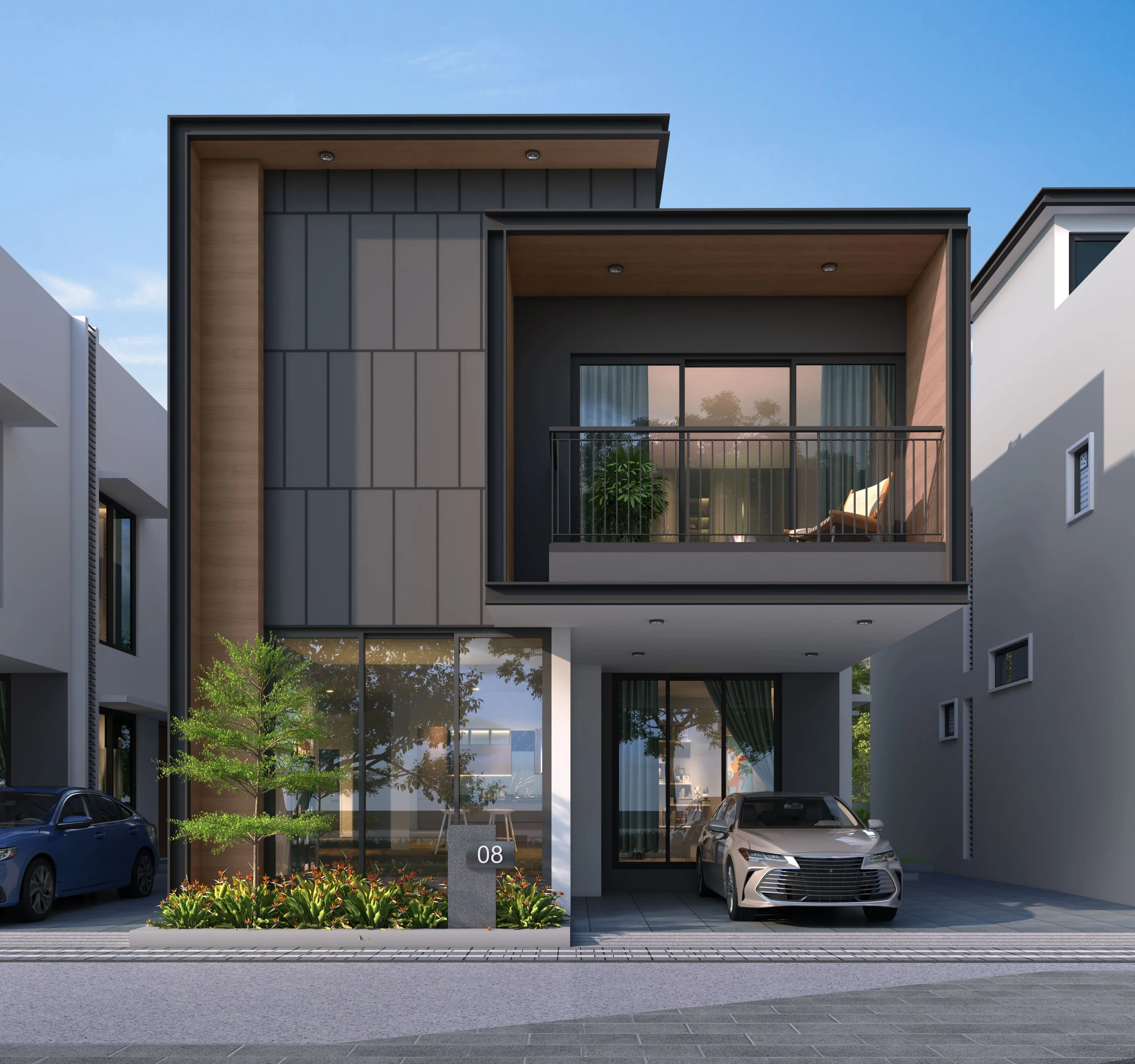 : Interlocking paver block / equivalent flooring with demarcated driveway with elegant lighting as per landscape design intent